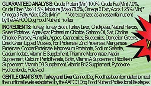 This Gentle Giants 90% Turkey Grain-Free Canned Wet Dog Food is a hearty recipe of Turkey, eight Non-GMO fruits and vegetables, including Blueberries, Cranberries, Apples, Pumpkin, Chickpeas, Sweet Potatoes, Parsley and Dandelion Greens which is great for liver and gastrointestinal health. Plus, it contains New Zealand Green Lipped Mussels (a natural source of glucosamine and chondroitin) for joint health. It contains NO corn, wheat, gluten or soy and no artificial fillers, flavors, or preservatives-just essential vitamins, minerals and anti-oxidants for a balanced and nutritious meal that’s veterinarian-approved and perfectly formulated to support your dog’s daily life from puppy to senior.