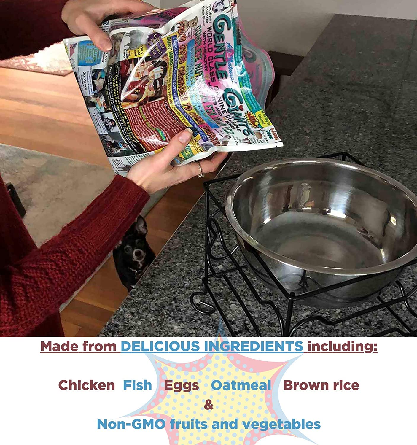- DELICIOUS INGREDIENTS – made with chicken, fish, eggs, oatmeal, brown rice, non-GMO fruits and vegetables including cranberries, blueberries, apples, tomatoes, carrots and more. 3.5lbs bag