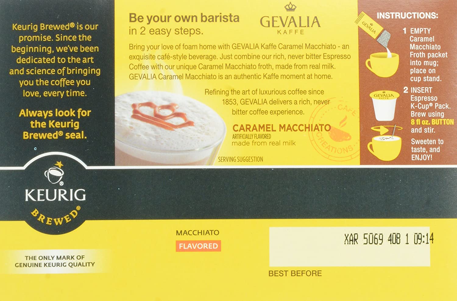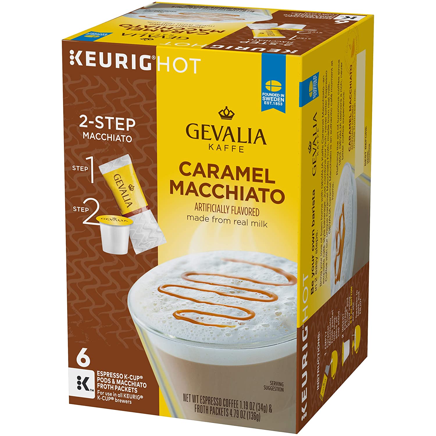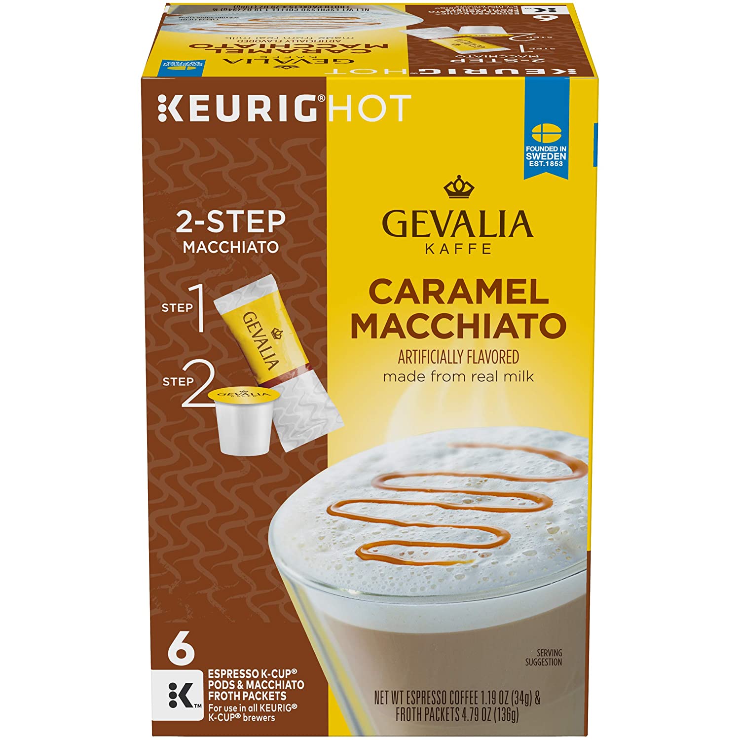Gevalia Caramel Macchiato K Cup Espresso Pods with Macchiato Froth Packets deliver a premium cafe-style experience by combining rich, never bitter espresso coffee with unique macchiato froth packets made from real milk. Crafted with 100 percent roasted Arabica beans sourced from around the world, the rich dark roast espresso caramel coffee is layered with delicious caramel flavor and topped with creamy foam to create a cup that satisfies with a rich and creamy finish. The two-step brewing process is quick and easy. Simply empty the macchiato froth packet into your mug; place on the cup stand. Insert the K Cup espresso pod into your Keurig brewer and select the 8 oz. brewing size. Stir and sweeten to taste. This convenient single-serving macchiato K Cup system is compatible with all Keurig 1.0 & 2.0 brewing systems. This box of Keurig K Cups contains 6 espresso coffee pods and 6 macchiato froth packets. Try Gevalia and experience the taste of 150 years of Swedish tradition. With over 30 premium coffees, from intense dark roasts to exotic varietals, you are sure to find your perfect sip.