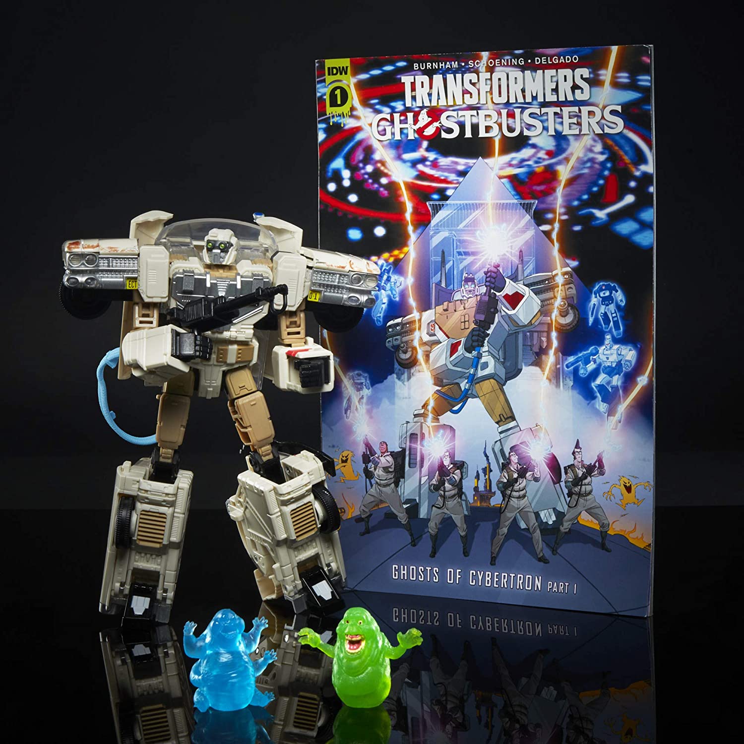 The worlds of Transformers and Ghostbusters collide through the Transformers Collaborative! Its the world of Transformersand Ghostbustersa world of heroic Autobots, evil Decepticonsand ghosts!The iconic Ecto-1 Cadillac from the Ghostbusters: Afterlife movie is now a Transformers robot called Ectotron! The Ectotron figure converts between Ecto-1 and robot modes in 22 steps, and comes with a Proton Pack and Blaster accessories, Slimer and Muncher ghost figures, and issue number 1 of the Trans