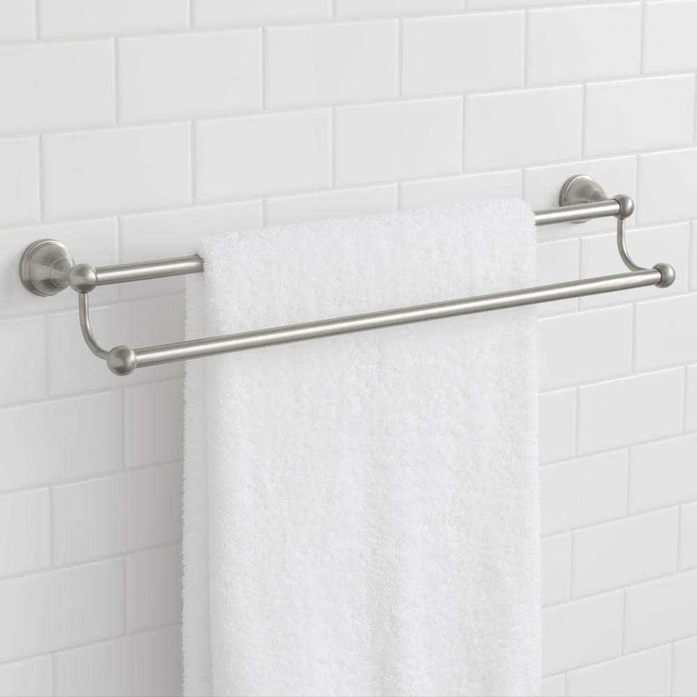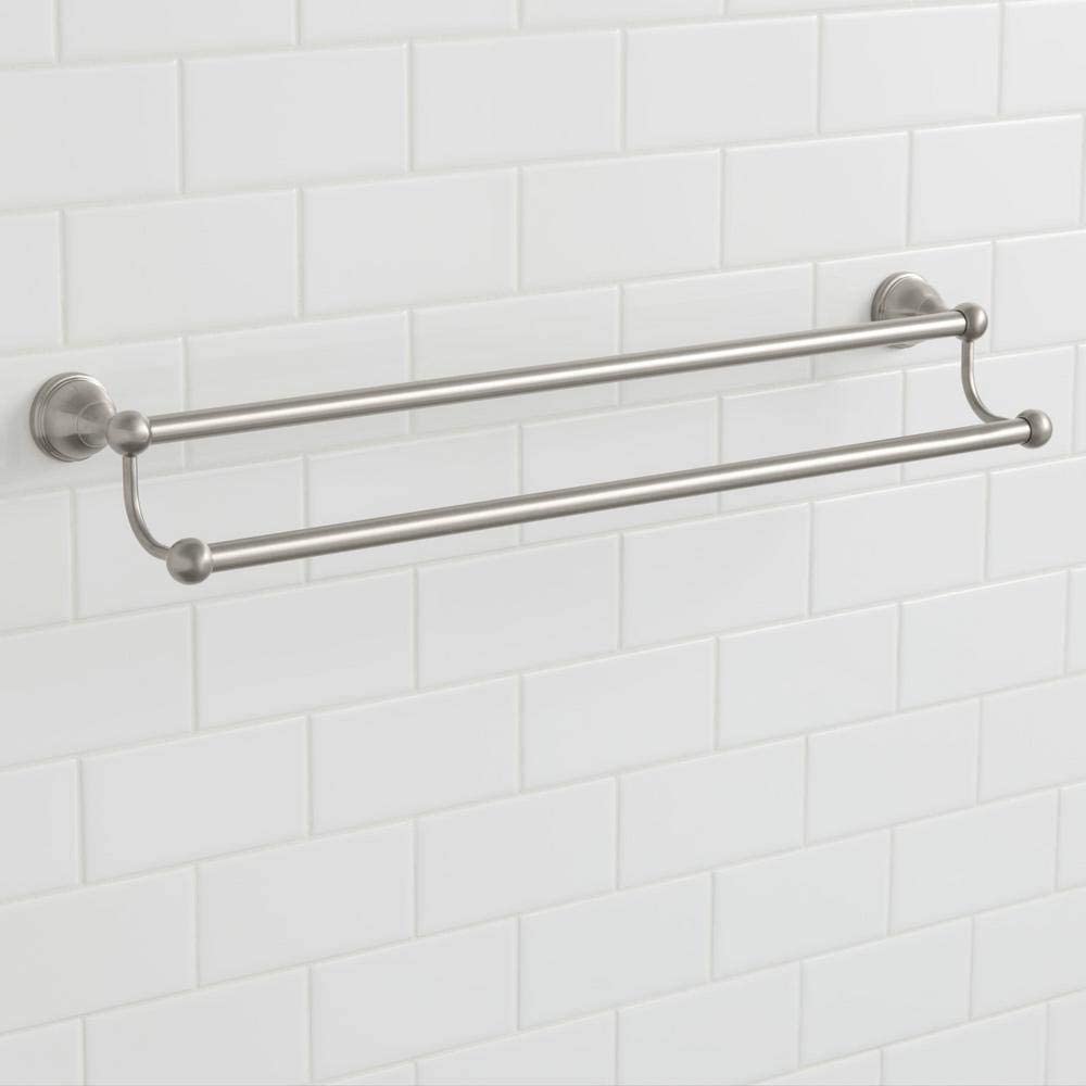 Glacier Bay Mandouri Series 24 in. Double Towel Bar in Brushed Nickel has a sophisticated design and brushed nickel finish that will provide instant elegance and functionality to any bath or powder room decor. Durable and sturdy with aluminum construction, this towel bar is easy to install with mounting hardware and plastic anchors included. Coordinate with other brushed nickel pieces from the Mandouri Collection to give your decor a polished and pulled-together look that is as functional as it is beautiful. Brushed nickel finish will complement a wide range of decor styles Durable aluminum construction Easy to install