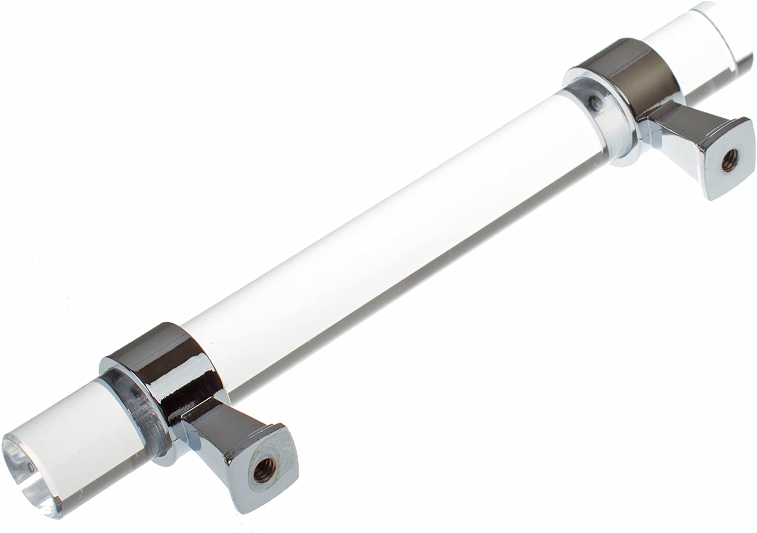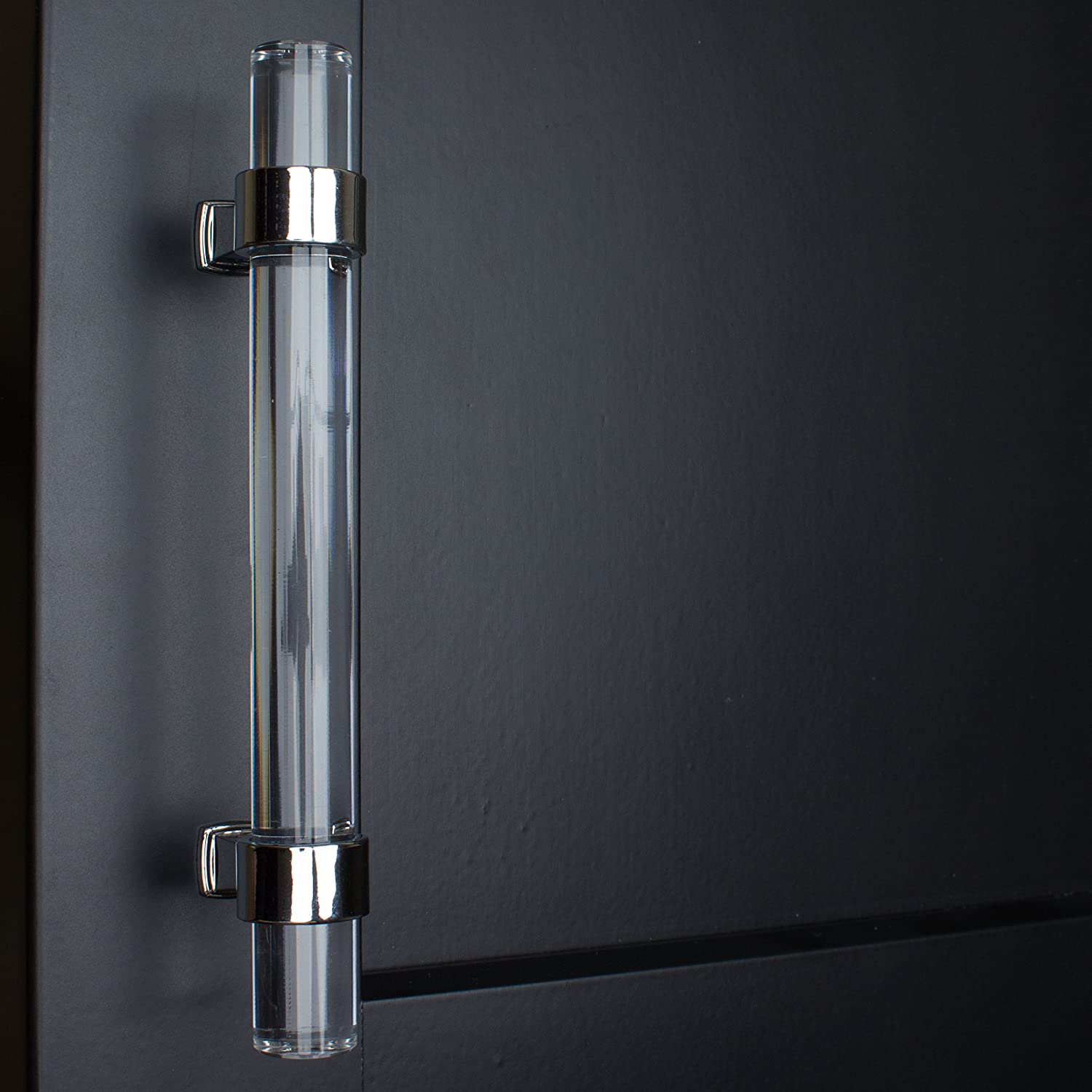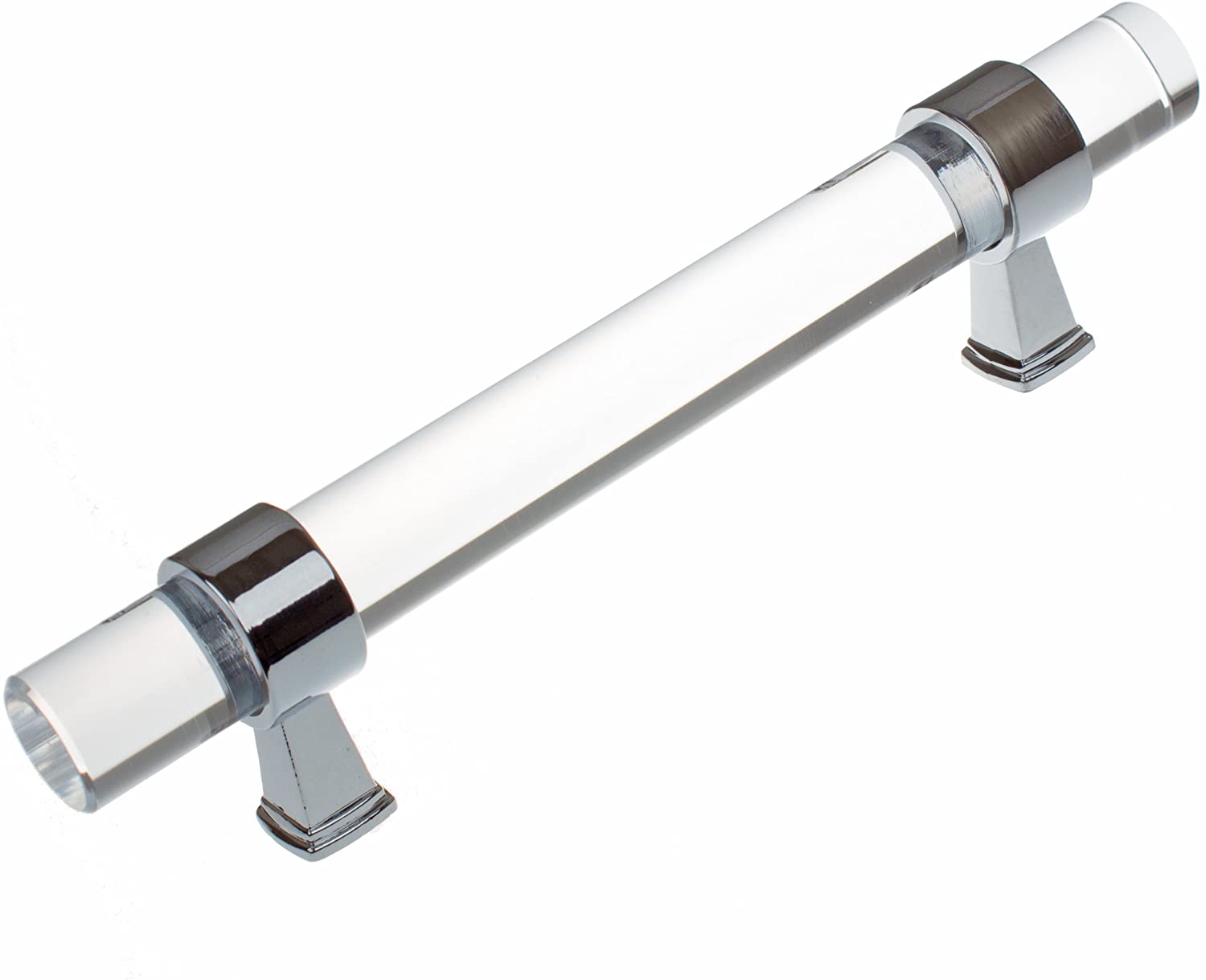 These 3.75-Inch cc clear acrylic cabinet drawer pulls from GlideRite Hardware will add a unique touch to your kitchen and bathroom cabinet drawers. They will easily blend well with the rest of your décor. Each Lucite pull also features two polished chrome bases. Every pull is packaged individually to prevent damage to the finish and come with necessary hardware for easy installation.