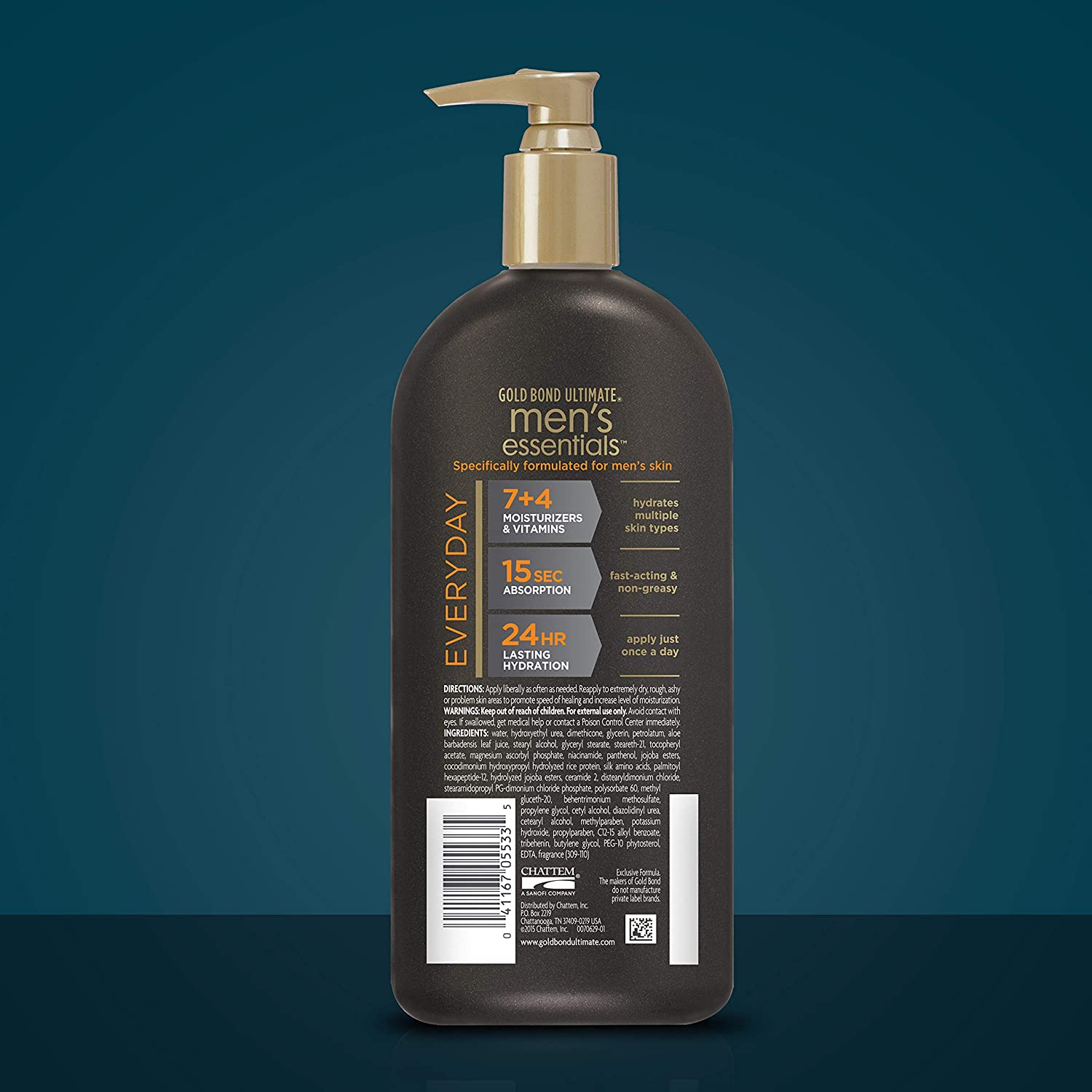 Gold Bond Ultimate Mens Essentials Everyday Hydrating Lotion. Specifically formulated for mens skin. Hydrates multiple skin types 15-second absorption. Fast acting and non-greasy. 24-hour lasting hydration apply just once a day, 7 essential moisturizers. Light fresh scent.