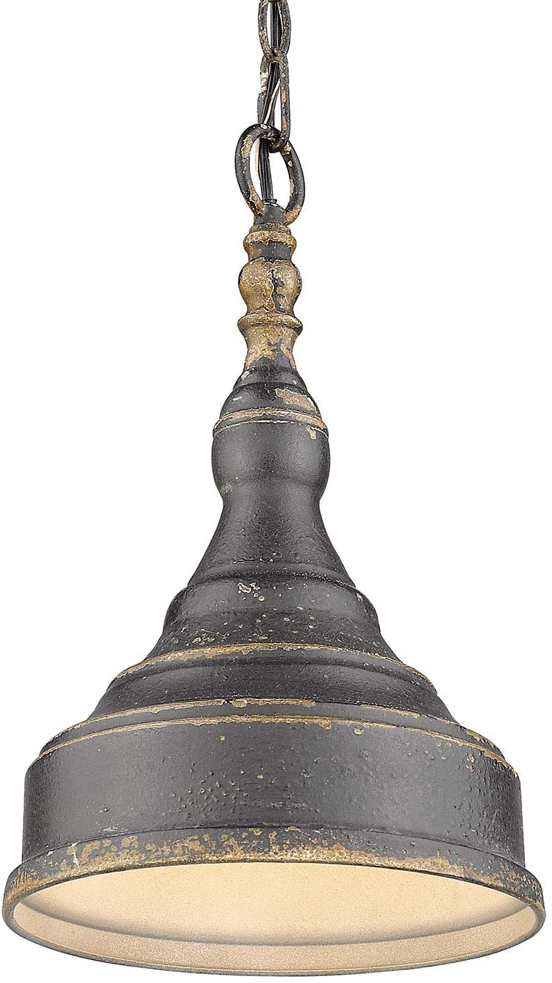 This one-light pendant will fit beautifully in a farmhouse style room. The Antique Black Iron finish features a rusty patina that takes you back in time. To reflect even more light, this pendant is painted a warm cream color on the inside. This charming pendant provides great task lighting and is safely rated for all locations, including damp areas like bathrooms. All mounting hardware is included for easy installation.