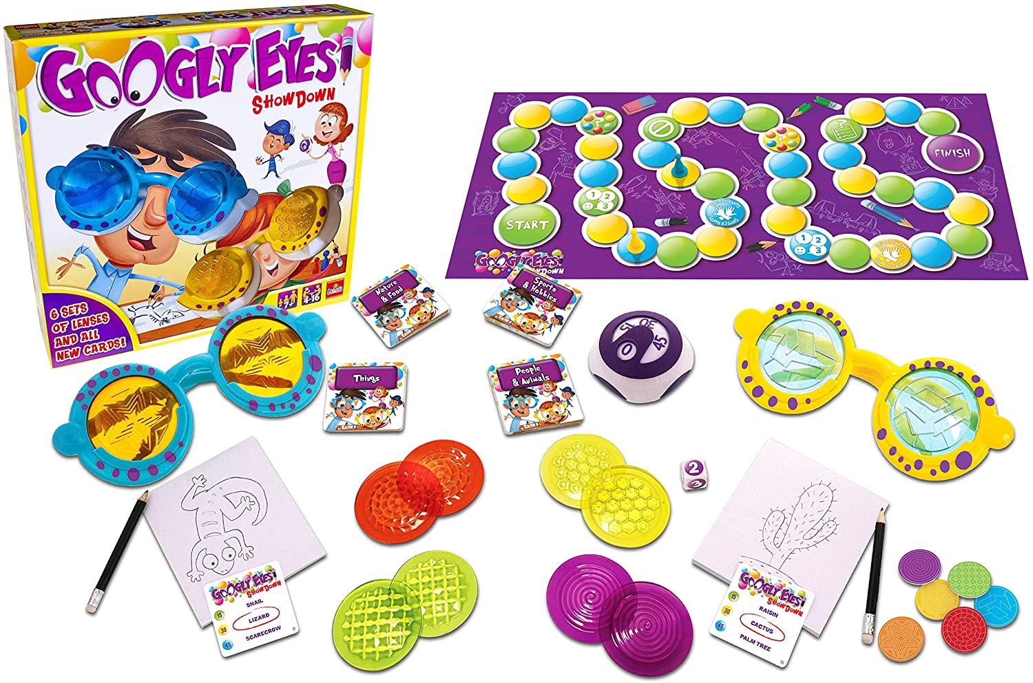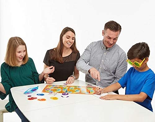 Googly eyes is the hilarious family game that challenges your vision and leaves you googling for more! Put on the zany, vision-altering Google Eye glasses, and start to draw while your team tries to guess what you're drawing. Is that an igloo or a turtle? A birthday cake or a fortress? Players take turns drawing and guessing, so everyone gets a chance to wear the glasses. The glasses come with three sets of lenses that range from mild changes to mind-blowing fun, so no one can see (or draw) straight! Googly eyes is a fun twist on classic drawing games that lets players of different ages and skill levels compete on equal terms, since the goggles make it fun and challenging for everyone. The first team to reach finish wins! For 4-16 players, ages 7 and up.