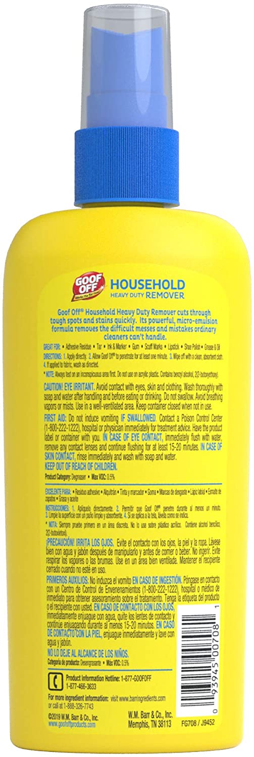 - Goof Off Household Heavy Duty Remover works the first time, cutting through tough spots and stains quickly