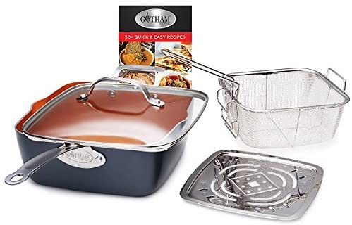 Meet the Gotham Steel pan with our revolutionary ti-cerama coating that combines super strong titanium fused with super slick ceramic for the perfect balance of nonstick and durability. With nothing sticking to the pan and food sliding off like you're cooking on air, Gotham Steel will change the way you cook – and clean. We've tried everything from burnt cheese to melted candy with the same exhilarating result - nonstick and easy clean up. Award winning ti-cerama coating ensures the ultimate release -- everything just slides right off the pan, No need for oil or butter ultra-durable, Scratch-proof & metal utensil safe aluminum composition ensure even heating distribution all around> Lightweight design makes for a comfortable cooking experience> oven safe up to 500° F dishwasher safe stay cool handles> toxin free – All Gotham Steel products are PTFE, PFOA and pros free Set includes: cookware- 8. 5" Skillet>- 10. 25" Frying pan with lid- 1. 5-Quart pot with lid- 2. 5-Quart pot with lid- 5 quart Gotham Steel pot with lid- aluminum steamer insert- 9. 5" Deep square pan with lid- fry basket- steaming rack- 9. 5" Shallow square pan- cookbook