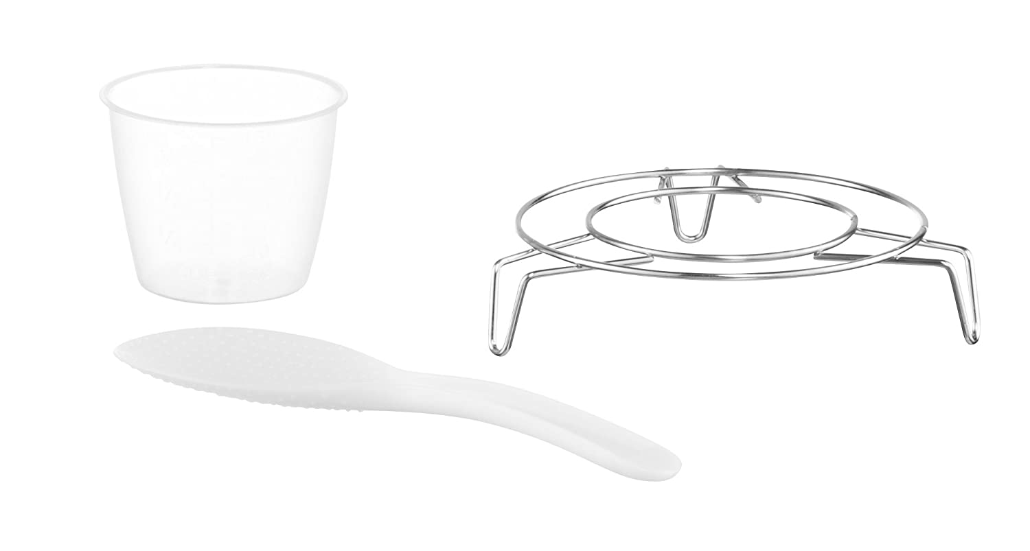 BONUS ACCESSORIES: Accessories include stainless steel steaming rack, measuring cup, condensation cup and mixing spoon.