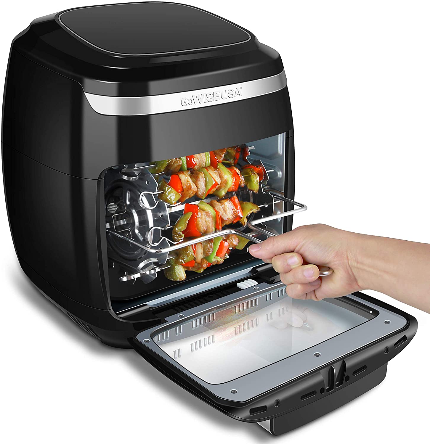 - 8 accessories for maximum cooking potential: comes with 8 accessories – everything you’ll need to make a homemade meal with ease. Accessories include a rotisserie tong, rotisserie rod, drip pan, skewer rotisserie, rotisserie Cage, and 3 mesh trays. (Note: max weight for rotisserie rod and forks is 4. 5 pounds)