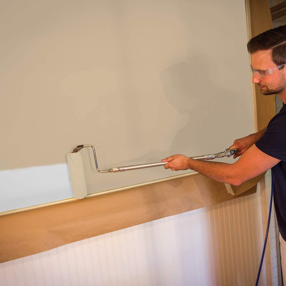 Transforms the paint sprayer into a rolling system for increased versatility. Using the roller kit is four times faster than a traditional roller while eliminating the mess of a roller tray. Pressure rolling is ideal when spraying is not possible. The Pressure Roller Kit includes a 9 inch stainless steel roller frame, 45-degree paint gun adapter, 20 inch extension, 9 inch roller frame and 1/2 inch nap roller cover.