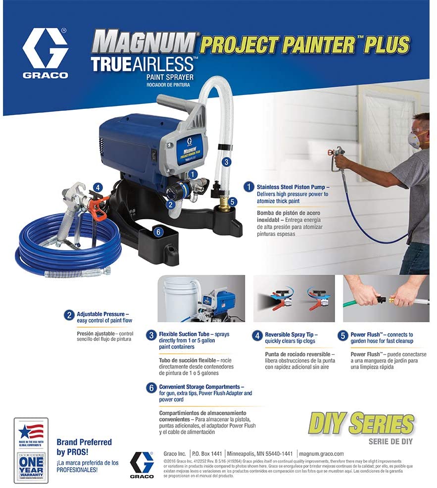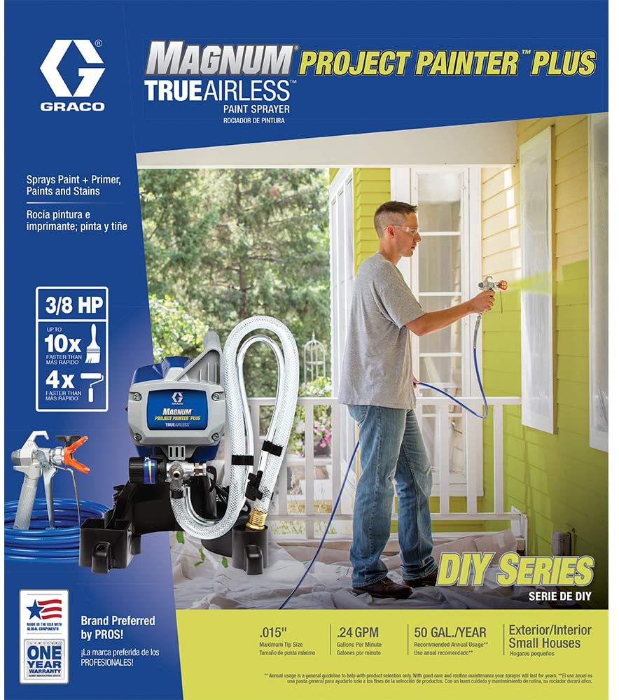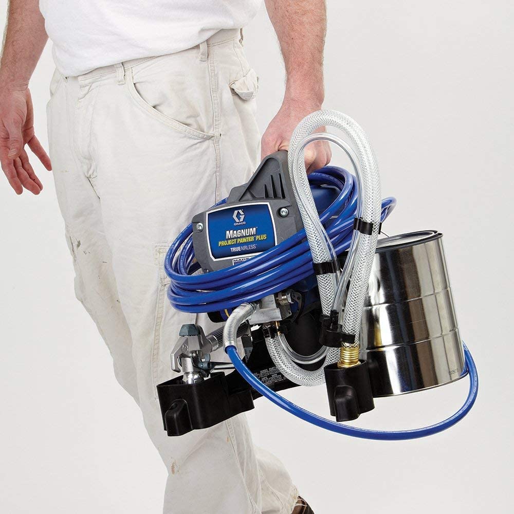 The DIY Series are perfect entry-level sprayers for tackling home projects such as doors, trim, furniture, interior walls, ceilings, decks and fences. Ideal for those painting up to 50 gallons per year. The Magnum Project Painter Plus delivers amazing results with speed and finesse, allowing you to finish your project in half the time it would take using brushes and rollers. The high-speed performance of this sprayer puts you in the driver's seat with fully-adjustable pressure. Give your projects the reach they need, since this lightweight sprayer can support up to 50 ft. of paint hose. You can spray directly from a 1 or 5 gal. bucket with its flexible suction tube and clean up in no time with the PowerFlush adapter.