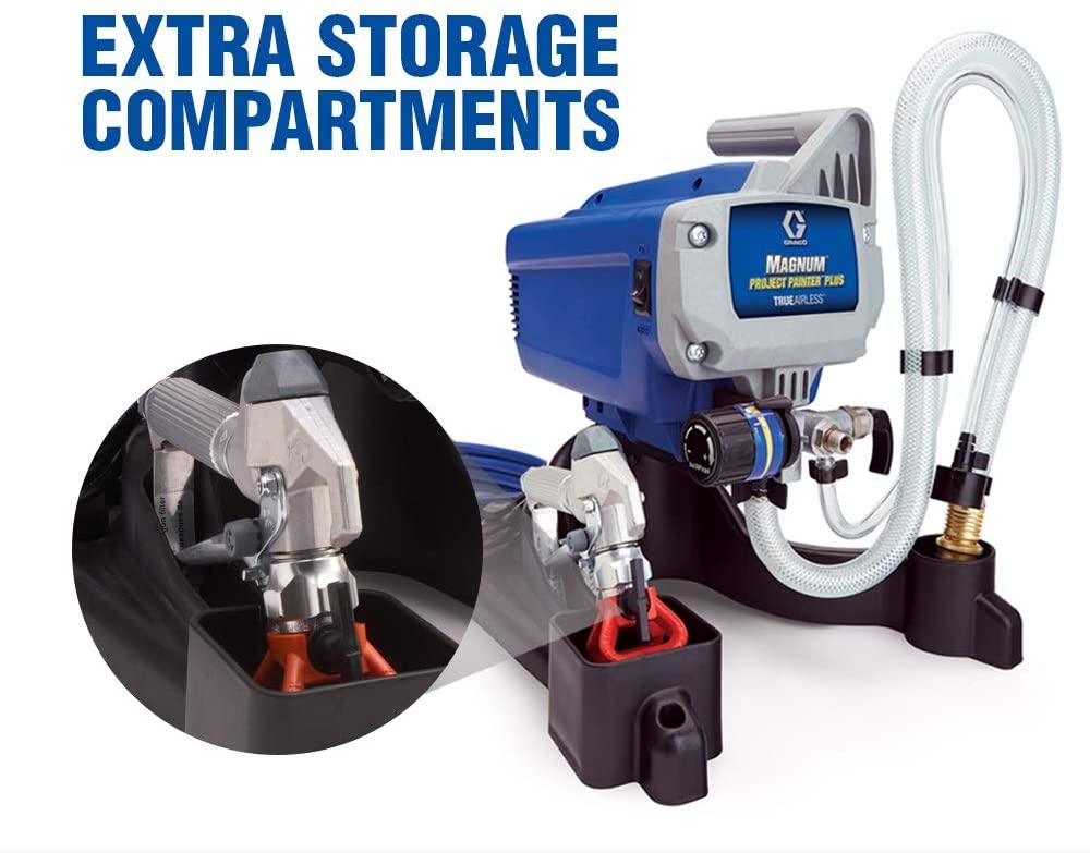 - EASY TO STORE: Extra storage compartments provide space to store the spray gun, extra spray tips, and power cord