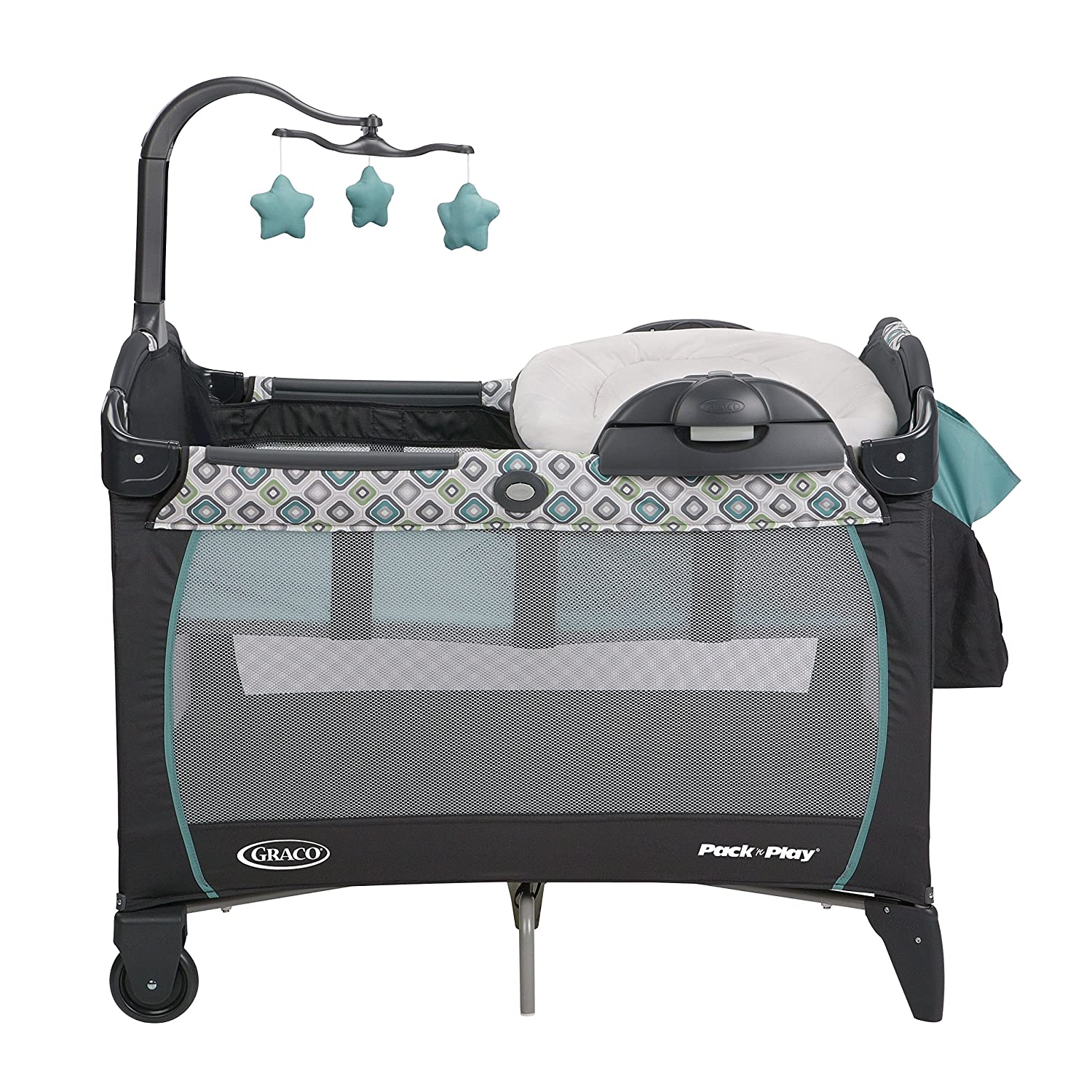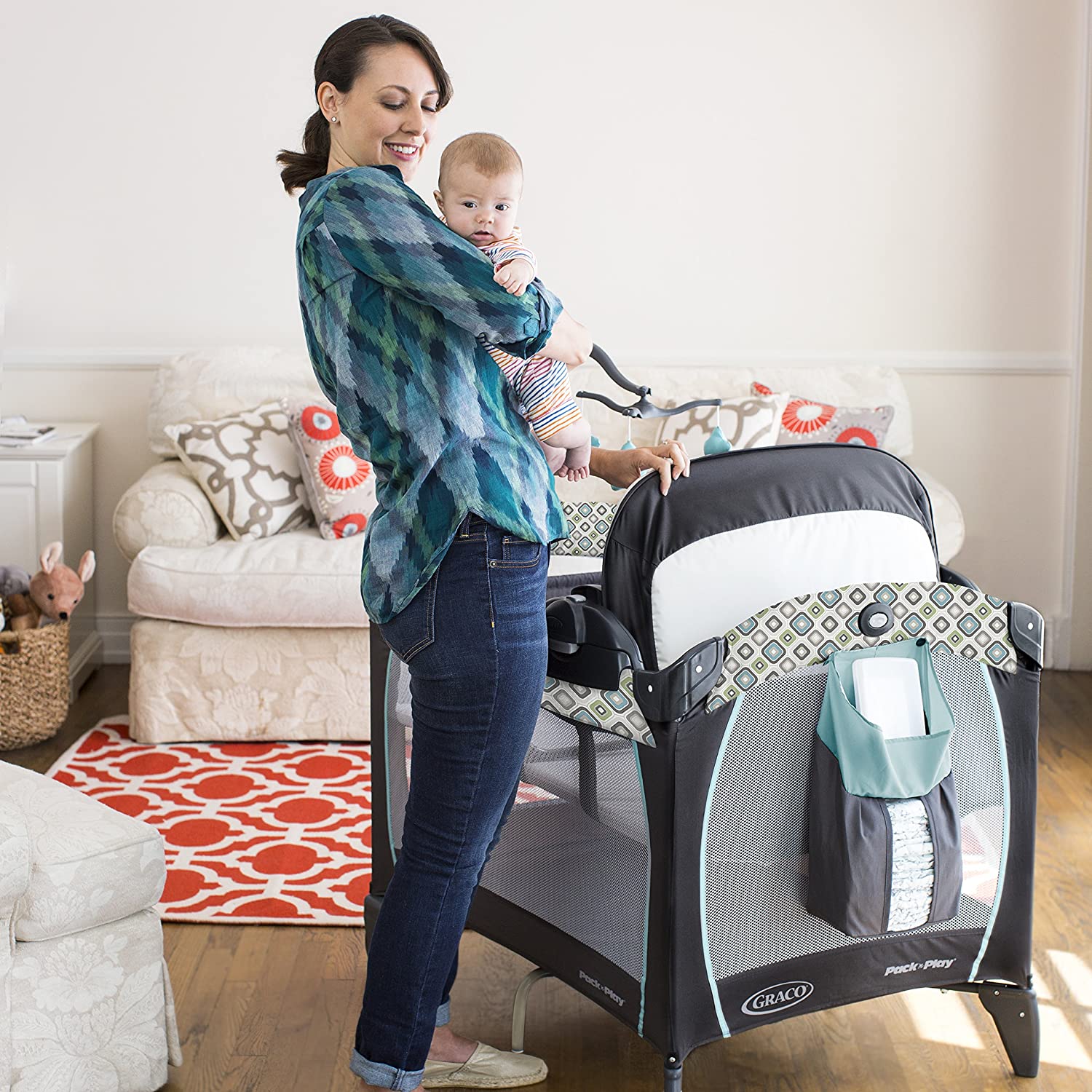 Graco's Pack 'n Play Playard Portable Napper and Changer, in Affinia, gives you a portable care station that moves with you. The reversible unit easily transitions from a cozy rest space just for your newborn over to a changer for easy changes to keep baby clean and content. Smart convenience features like diaper stacker to keep essentials at hand, toy mobile for baby's entertainment, and wipe-clean changer fabrics for simple cleaning make this playard a joy to use. This playard grows with baby - from newborn to toddler - thanks to the portable Newborn Napper station, removable infant bassinet and roomy portable playard space. Always press down on the left side of the clip, then the right. To prevent falls, stop using the product when infant: Begins to wiggle out of position or turn over in the product or Head touches the upper edge of the product or Weights more than 15 pounds. Machine wash carry bag in lukewarm water.