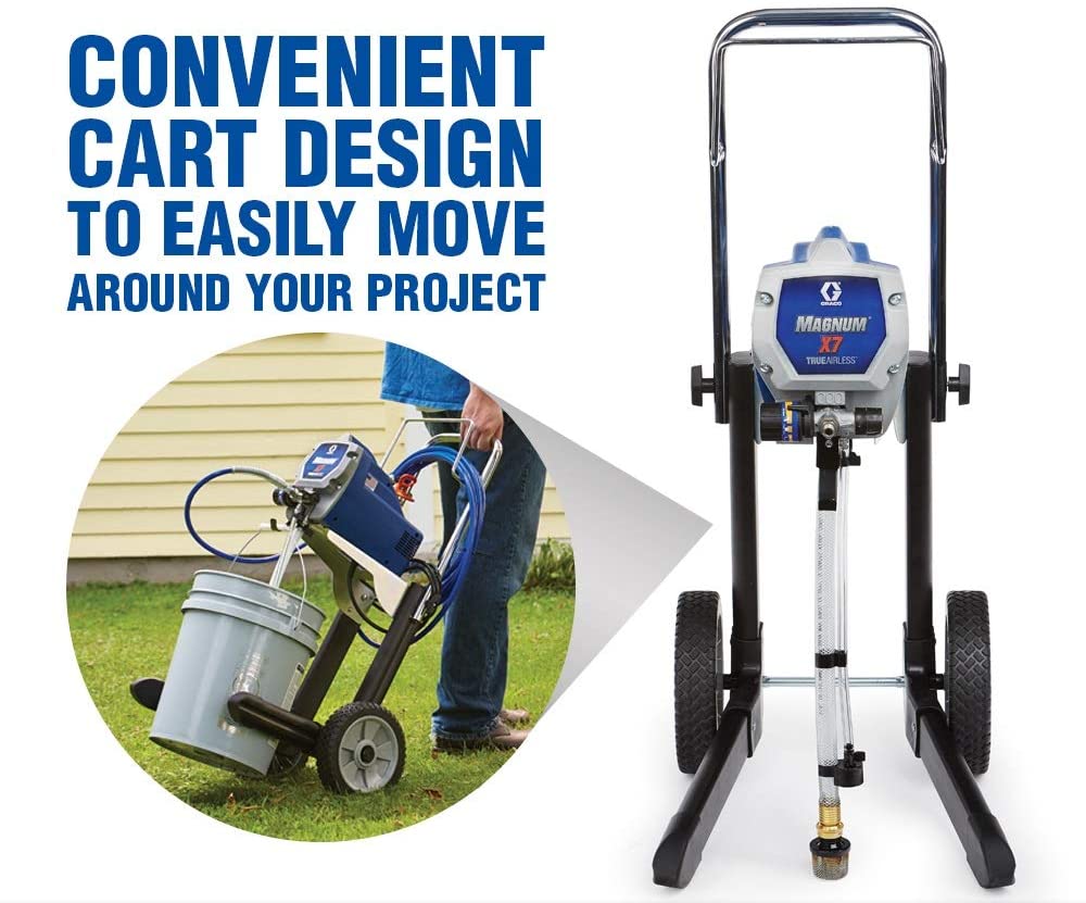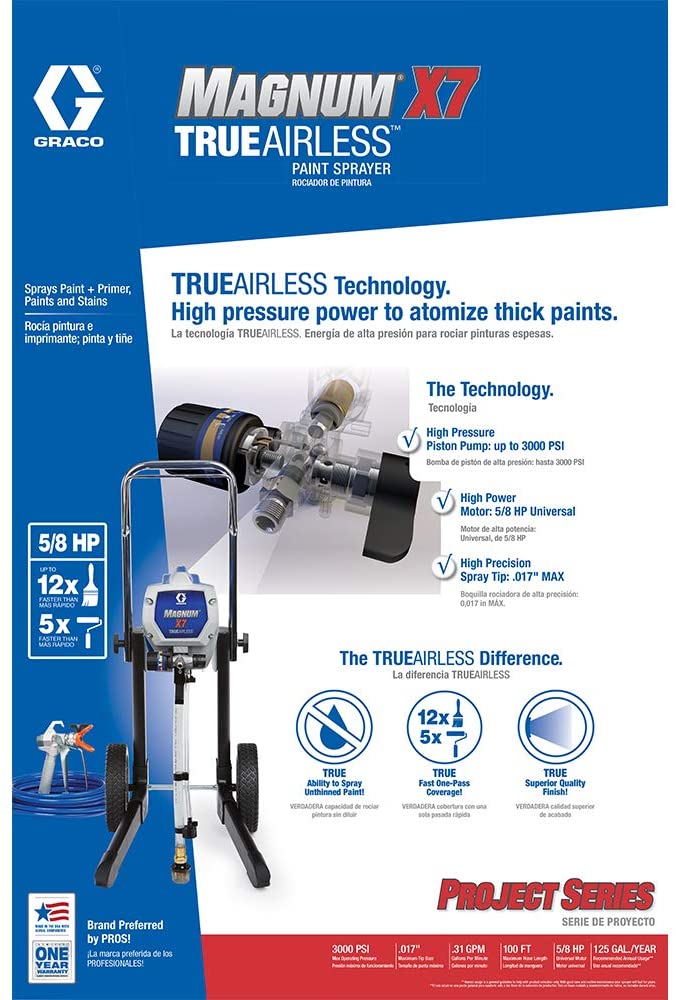 The Graco Project Series sprayers make it easy for avid DIY homeowners and handymen to power through small to midsize jobs with speed and finesse. DIY homeowners and handymen are equipped to save time and money with the Magnum X7. Tackle any indoor project, exterior homes, fences or decks. Includes SG2 Metal Spray Gun, RAC IV 515 Switch Tip, 25 ft. Durable paint hose, Pump Armor storage fluid, Power Flush adapter, Quick Start-Up Guide and Operation Manual. Inlet Paint Strainer- 35 Mesh Stainless Steel Screen.