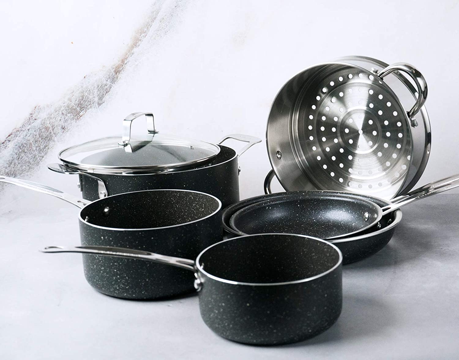 - COMPLETE KITCHEN SET This extensive cooking set includes all the necessary pieces to make sure you have what you need to prepare, cook and serve a meal. It includes 8.5” fry pan, 10.25” fry pan with lid, stainless steel steamer insert, 1.5 Qt. saucepan with lid 2.5 Qt. saucepan with lid 5 Qt. stock pot with lid