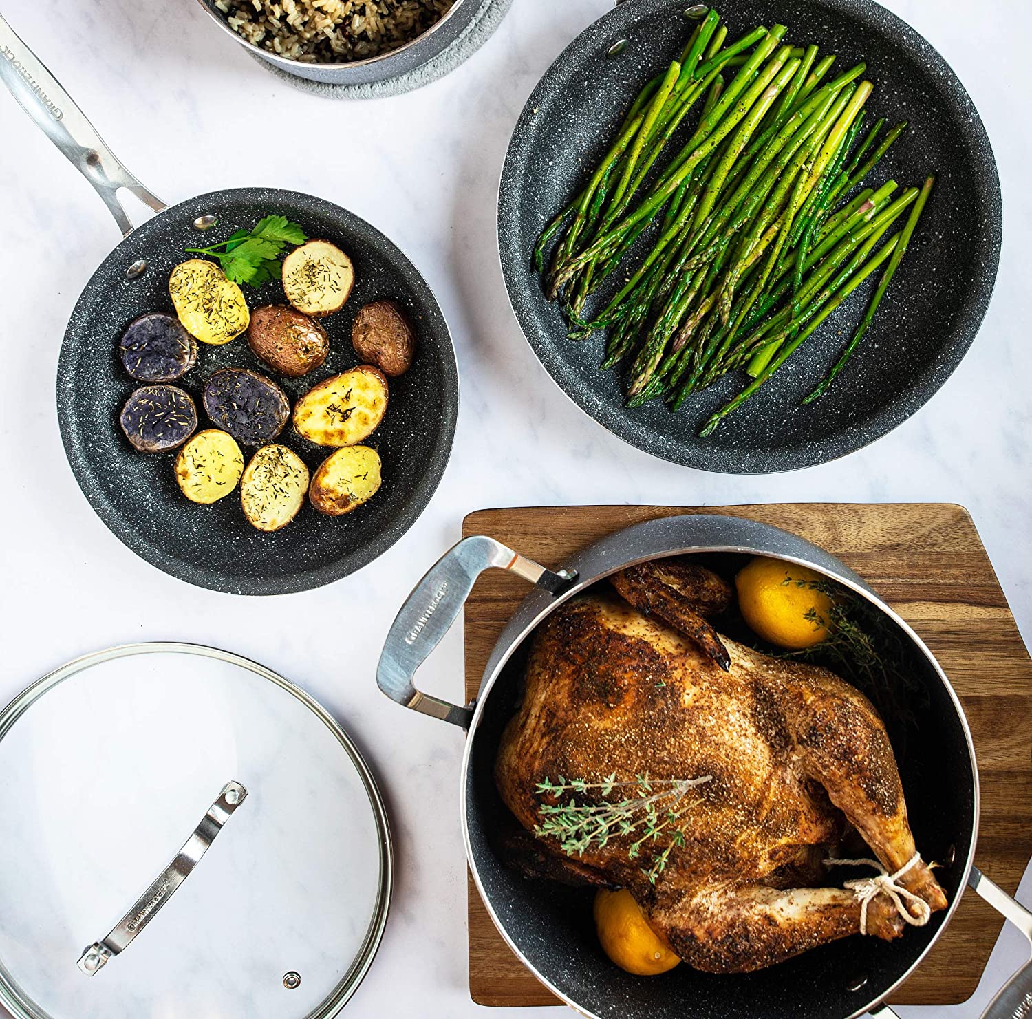 - MULTILAYER NONSTICK and EVEN SURFACE HEATING Makes food release, cleaning, flipping and tossing easy and allows for healthy cooking. The GRANITESTONE pan is an efficient heat conductor, heats evenly, and thus cooks food to brown perfection, even thick slabs of steak!