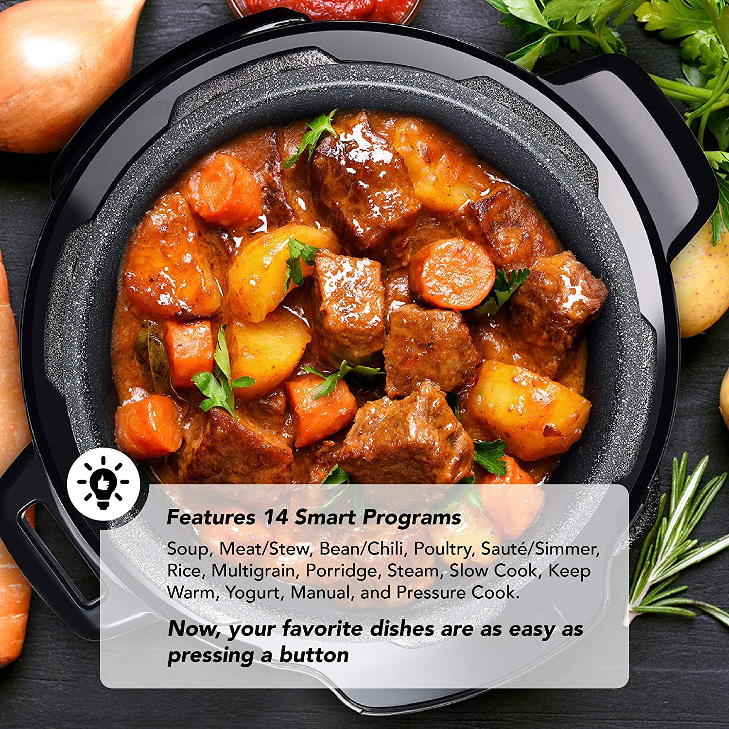 ALL-IN-ONE-COOKER: Pressure cooker and slow-cooker; also comes with 12-presets: soup/broth, meat stew, bean chili, poultry, rice, multi grain, porridge, steam, slow cook, yogurt, saute, and manual to make cooking easier and better!