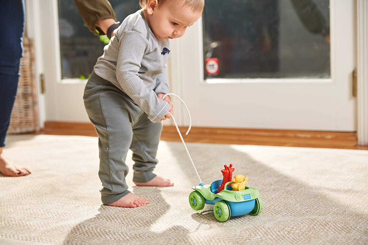 Buckle up for a jungle adventure with the Green Toys Dune Buggy! this chunky, blue and Green pull toy is the perfect toddler toy to help develop balance and coordination, fine motor skills, and cause and effect reasoning. As the wheels roll, the giraffe driver rocks back and forth, while the monkey in back bounces up and down. Made in the USA from 100% recycled plastic milk jugs and a 100% cotton rope, this super-safe vehicle has no metal axles or small parts. No BPA, phthalates, or PVC and Meets FDA food contact standards. Packaged with recycled and recyclable materials printed with soy inks. Color combinations may vary. For ages 6 months and up.