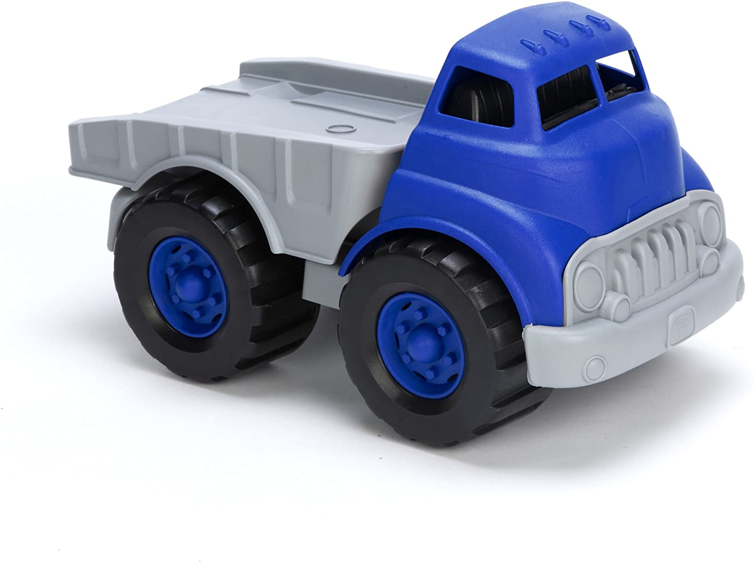 The Green Toys blue truck hauls the race car on its back, using grooves in the flatbed to keep the racecar's wheels in place. Kids can roll the blue truck and race car around together, or tilt the flatbed up to allow the car to roll off and be used on its own.