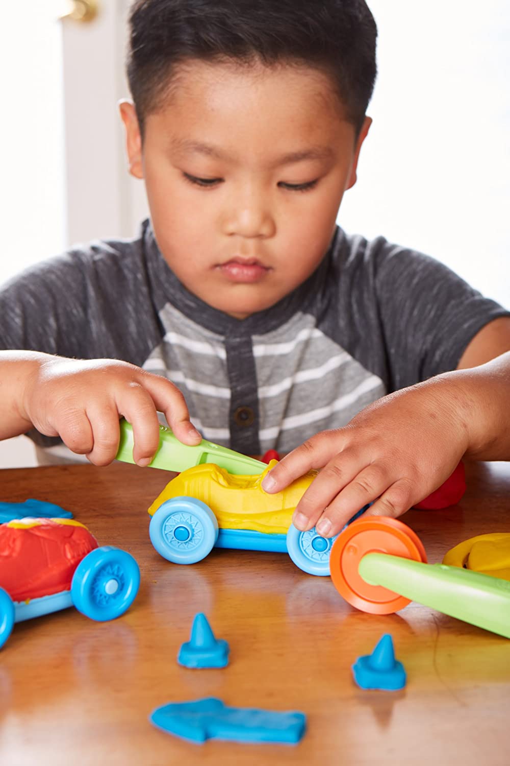 Mold! customize! race! this 12-piece set includes everything needed to create endless custom car designs: 2 race car chassis, 2 race car tops, 1 cone Maker, 2 arrow molds, 1 rolling cutter, 1 knife, 3 dough tubs. The Green Toys dough sets are the safe and simple way for kids as little as 2+ to enjoy the creative benefits of dough play. Each themed set features our non-toxic dough, made in the USA from simple ingredients like Organic flour and mineral-based colorant. We bundled it with quality tools and fun role play accessories, made in the USA from 100% recycled plastic and no BPA, phthalates, or PVC. These sets are designed to encourage open play and easily age-up with kids of all ages for dough play fun the whole family can enjoy. Tools are dishwasher safe. Packaged with recycled and recyclable materials printed with soy inks. For ages 2-8.