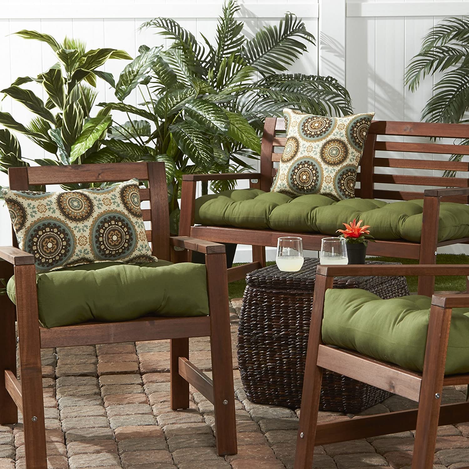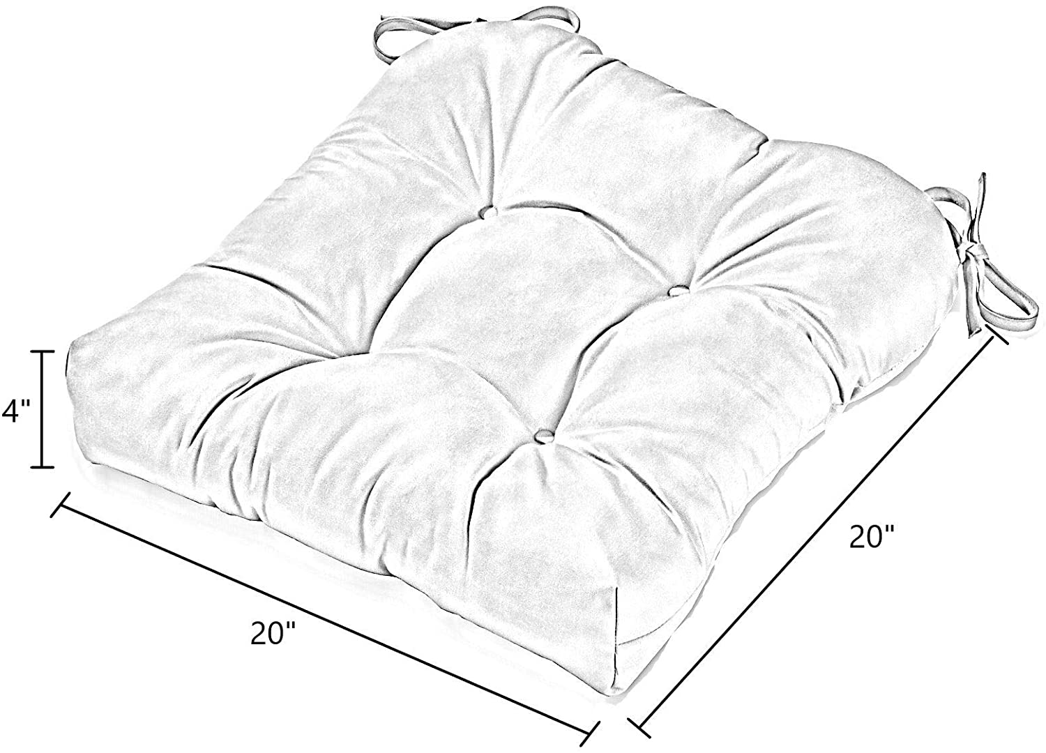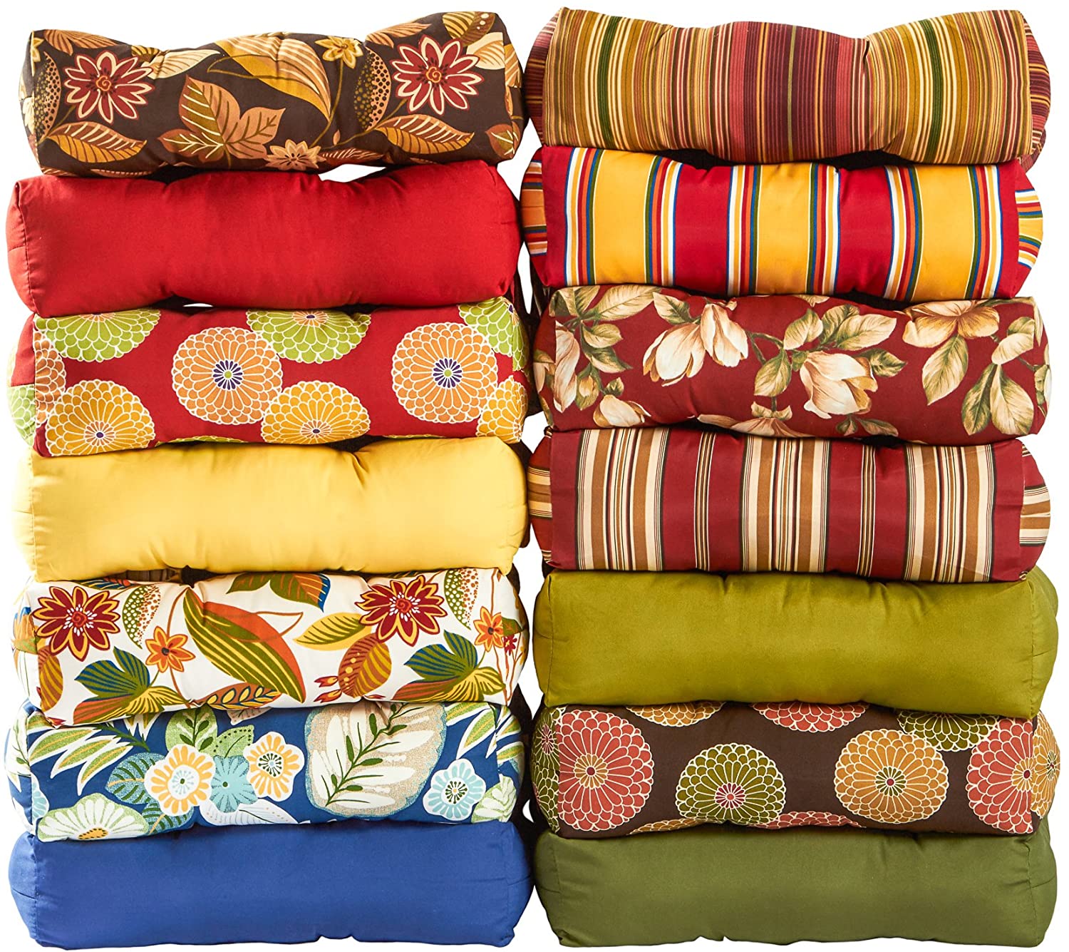 Enhance the look and feel of your patio furniture with this Greendale Home Fashions 20 inch outdoor dining cushion set. These cushions fit most standard outdoor furniture, and come with string ties to keep the cushion in place. Cushions are circle tacked to prevent fill from shifting. Each cushion is overstuffed for extra comfort and durability with 100% recycled, post-consumer plastic bottles, and covered with a UV resistant, 100% polyester outdoor fabric. Cushion shells are made in China, then filled and finished in the USA.