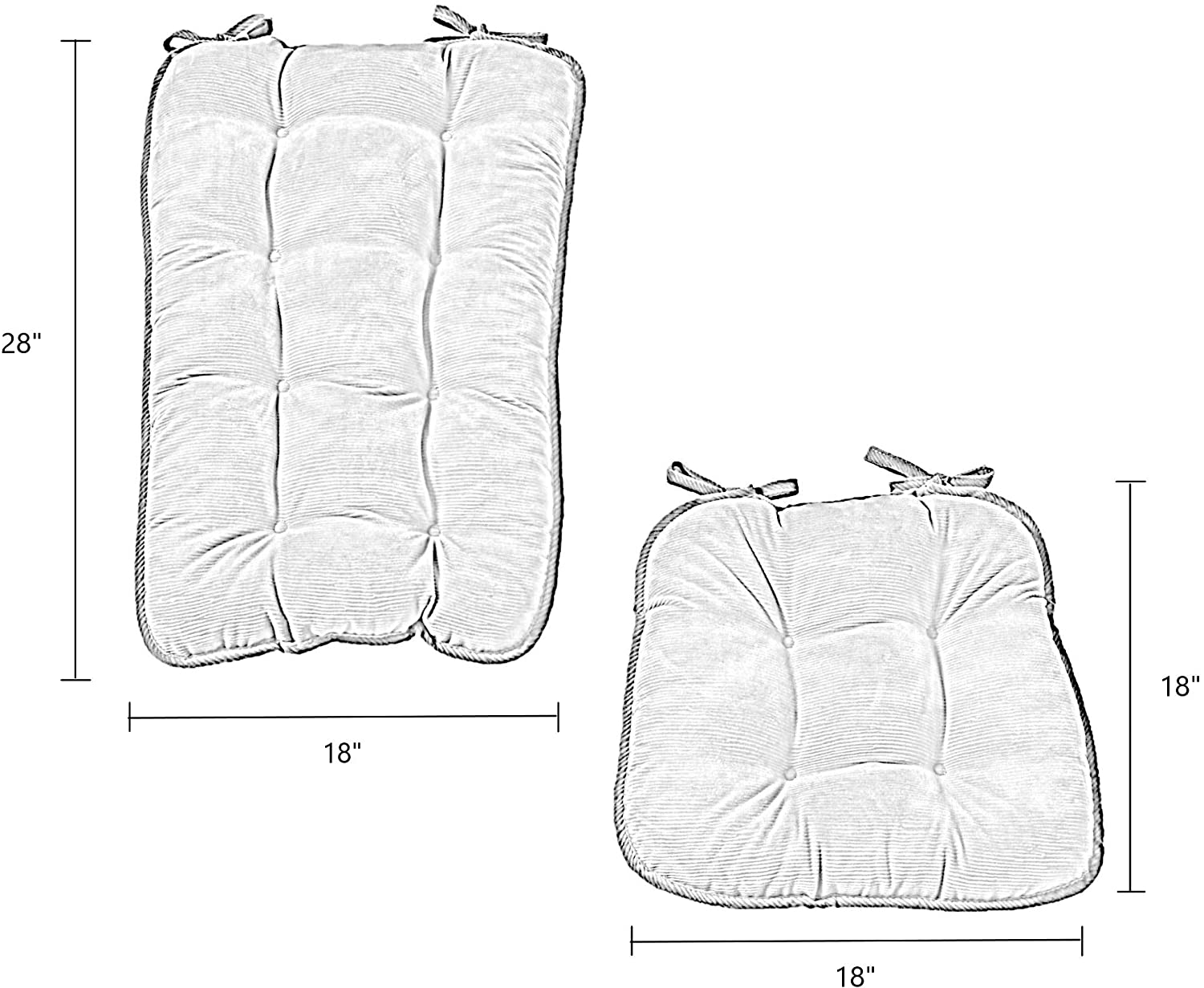 Add soft, plush comfort to your large rocker with this Greendale Jumbo Rocking Chair cushion set. Made from 100% ribbed nylon microfiber fabric in assorted solid colors. This rocker cushion set is fully reversible, and consists of two cushions: seat cushion (18"W X 18"D x 3" H), and back cushion (18"W X 28"H x 3" H). Cushions have a boxed, corded edge trim and 4 circle tacks. String ties are attached to the backs of both cushions. The rocker cushions are fully tufted and filled with 100% polyester fiberfill. Home furnishings for indoor use. Spot clean only. Filled and finished in the USA. (Cushions are + or – 1.5”)