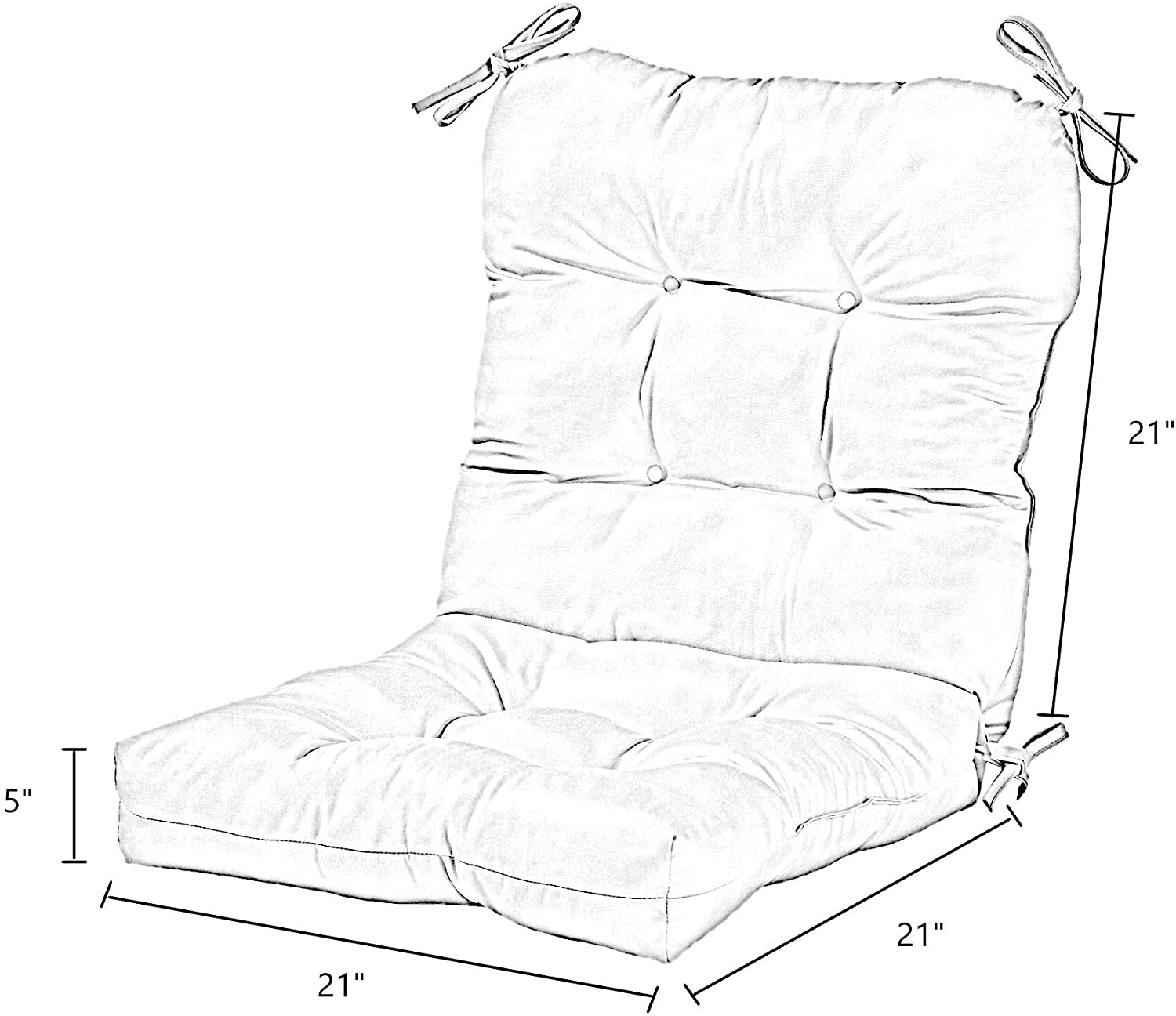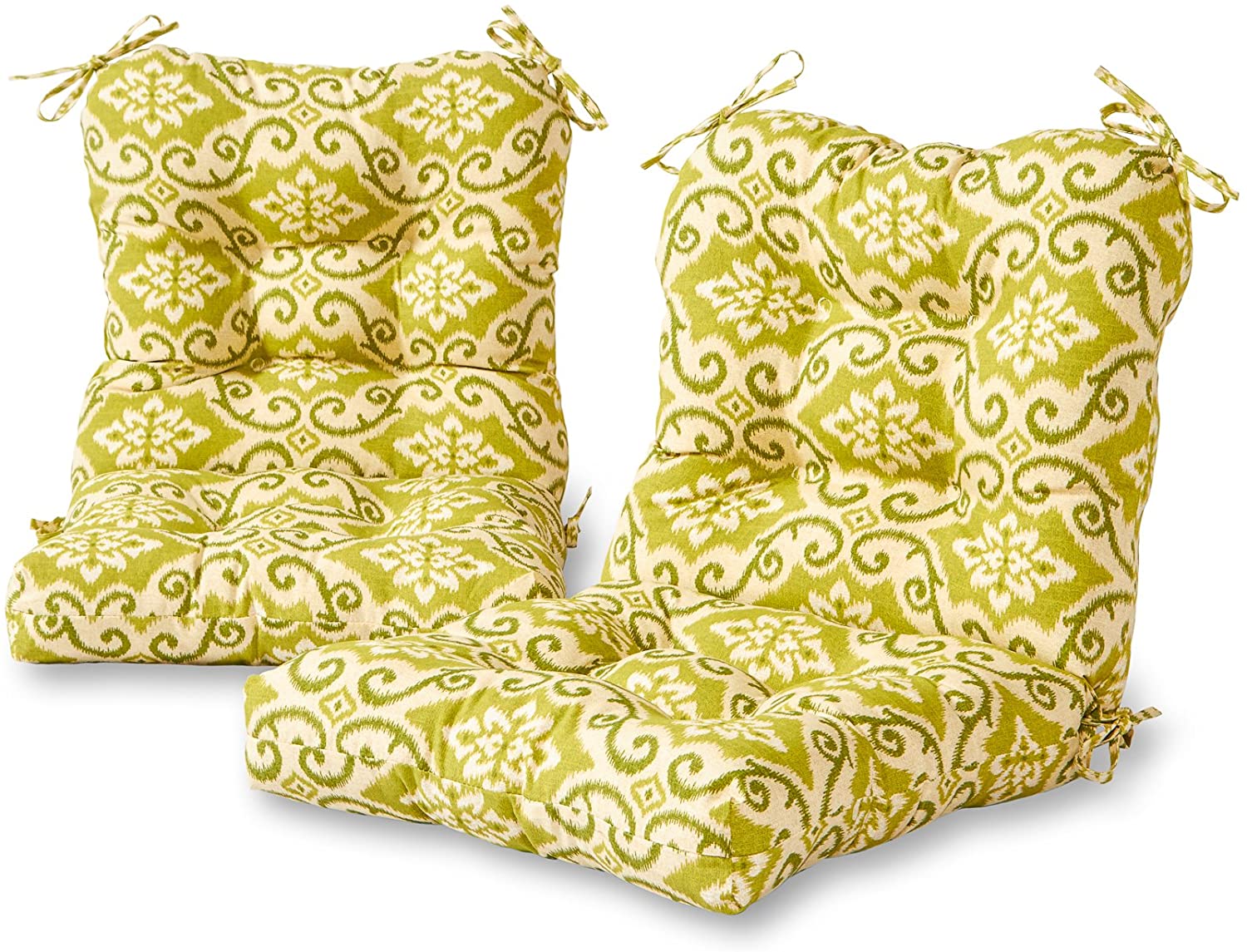 The Greendale Home Fashions Outdoor Seat/Back Combination Chair Cushions measure 42 x 21 x 4 inches. Each cushion is overstuffed with 100% soft polyester fill, made from 100% recycled, post-consumer plastic bottles, for added comfort, strength and durability. It's exterior shell is made from a 100% polyester UV-resistant outdoor fabric. Circle tacks create secure compartments which prevent cushion fill from shifting, while string ties secure cushions to outdoor furniture. A variety of modern prints are available.