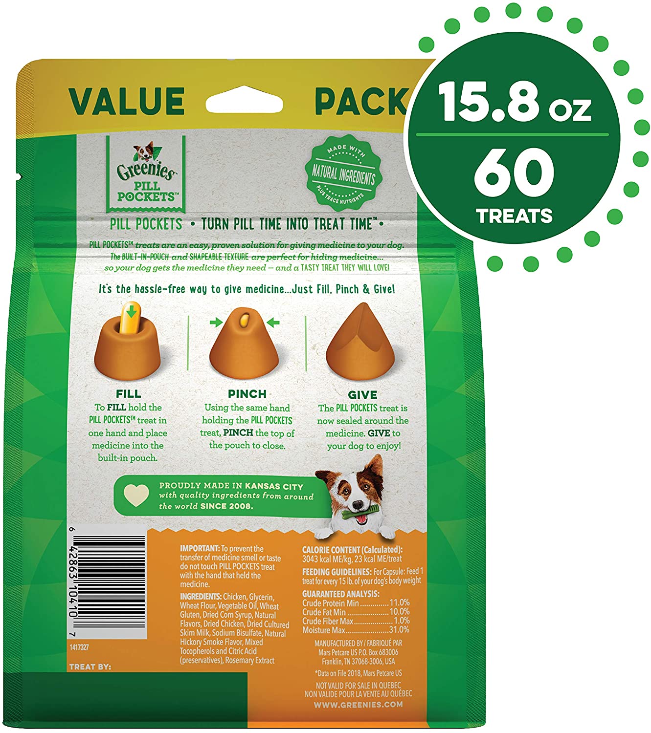 • Contains one (1) 15.8 oz. 60-count value pack of Greenies pill pockets capsule size natural dog treats chicken flavor; made with natural ingredients plus trace nutrients