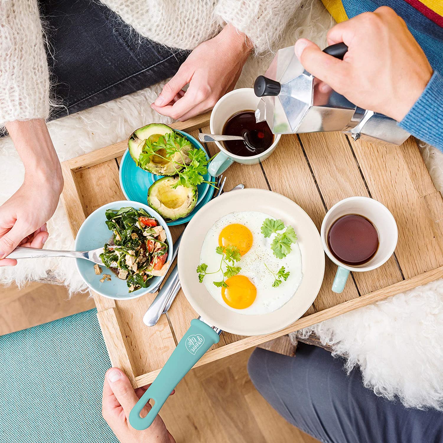 This Soft Grip frying pan is all about comfort and control. Designed for effortless performance and cleanup, this pan features our toxin-free Thermolon nonstick coating, which is free of PFAS, PFOA, lead, and cadmium. GreenLife’s healthy ceramic nonstick is not stuck in the past—that’s why our ceramic nonstick starts with sand and creates 60% less CO2 emissions during the curing phase than traditional coatings. This pan is also crafted with recycled aluminum, because we want your kids’s kids to cook healthy, too. Finished in vibrant colors, this pan is outfitted with a stay-cool handle to keep your cooking comfortable. For all stovetops, except induction. Oven safe to 350°F. Dishwasher safe.