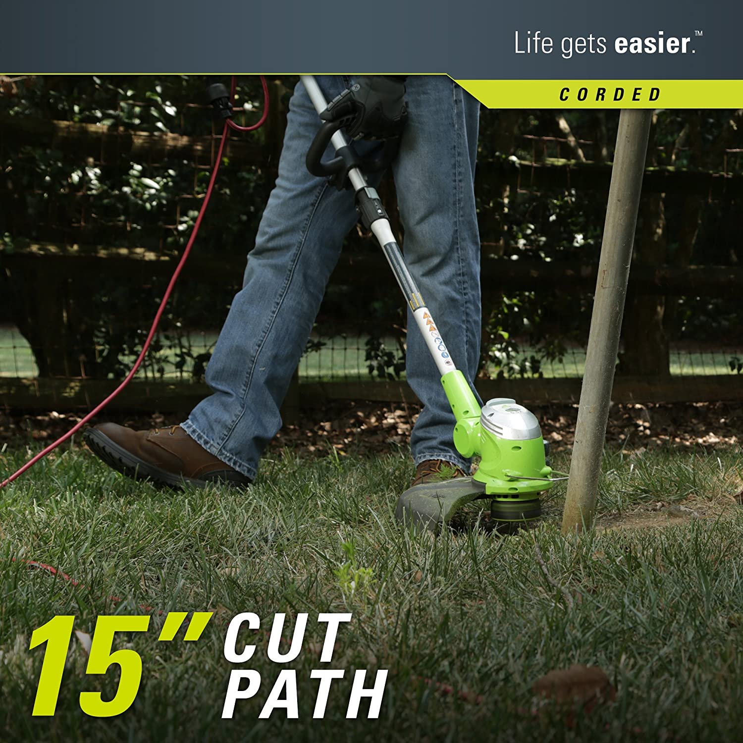 - 15-inch cut path with pivoting head allows for edging and trimming capability with edging wheel