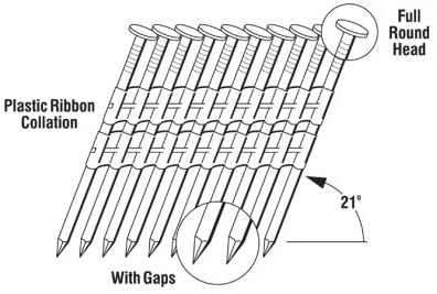 21° Stick Framing Nails - Plastic Collated - Primary applications include Framing, Sheathing, Subfloors and Roof Decking where corrosion protection is NOT NEEDED. Vinyl coated for easier driving and superior holding power. Full round head for added pull through strength. Designed for use in these tools: Bostitch N95RHN, N90RHN, N95-162, N88RH; Dewalt D51845, D51844; Hitachi NR83A, NR83A2, NR90AC, NR90AC2; Max SN890RH, SN80, SN90; Paslode 5325SRH, 5350/SRN-20. F350RH; Porter Cable FR350NC, FR350MAG, FR350, FR350A; Senco SN60, SN65, SN65C, FramePro 602,650,652,702XL and 752XL and many others. Grip-Rite® brand fasteners from PrimeSource Building Products, Inc.