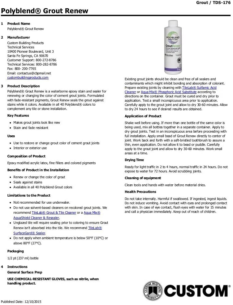 Polyblend Grout Renew is a waterborne epoxy stain and sealer for renewing or changing the color of cement grout joints. Formulated with fade-resistant pigments, Grout Renew seals the grout against stains while it colors. Available in several Polyblend colors to complement any tile or stone installation. Sample colors shown generally approximate the color of the grout. Final installed color may vary.