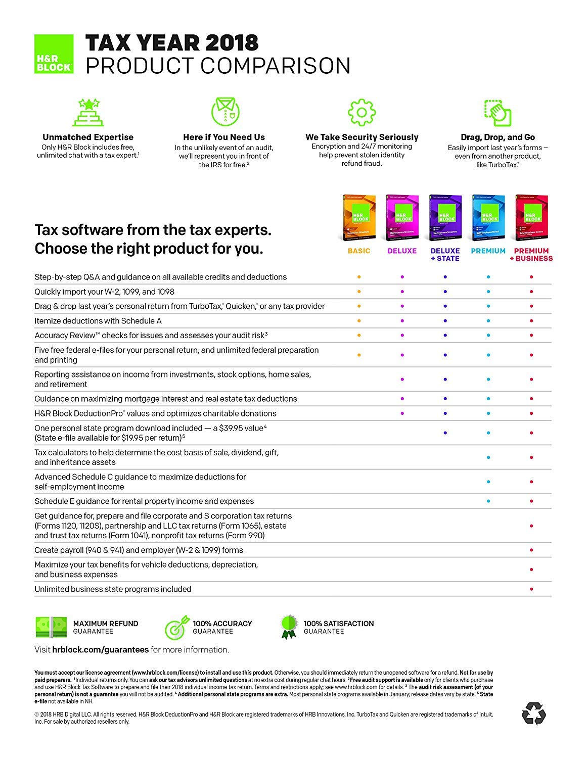 With H&R Block software, you can prepare your taxes with confidence knowing you're receiving an unbeatable value. H&R Block will guide you towards getting every credit and deduction you deserve - it's like a tax cut made just for you. Navigate tax time like a pro with help from H&R Block software. It guides you through the process of completing your taxes, so you can feel at ease. Helps homeowners and investors complete federal and state taxes for the 2018 tax year. Step-by-step guidance and audit support help make filing simple. Tax deduction finder helps you get the most out of your return. E-filing capability saves time and paper. Includes a CD-ROM.