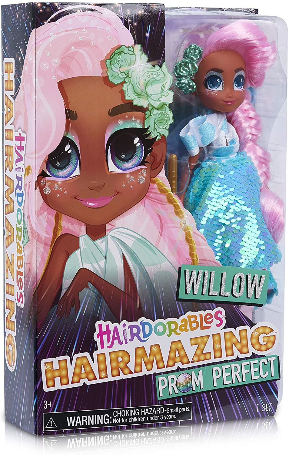 It’s Prom Season, and the Hairmazing Squad is making their grand entrance with the Hairdorables Hairmazing Prom Perfect Fashion Dolls. Willow is ready for a magical night with an exciting new prom style. Dressed in glamourous evening gowns showcasing each of their stylish personalities and a “Prom Hair, Don’t Care” attitude, these fabulous and fully articulated fashion dolls stand 10.5-inches tall. Open the cover and unbox each fashionable accessory to complete each prom-mazing look! The box even unfolds to reveal a prom-themed backdrop and dance floor. These #PromPerfect divas are ready to disco down and dance the night away! Look for all the Hairdorables Hairmazing Fashion Dolls, including Noah, Willow, Harmony, Kali, Bella, and Dee Dee. Ages 3+