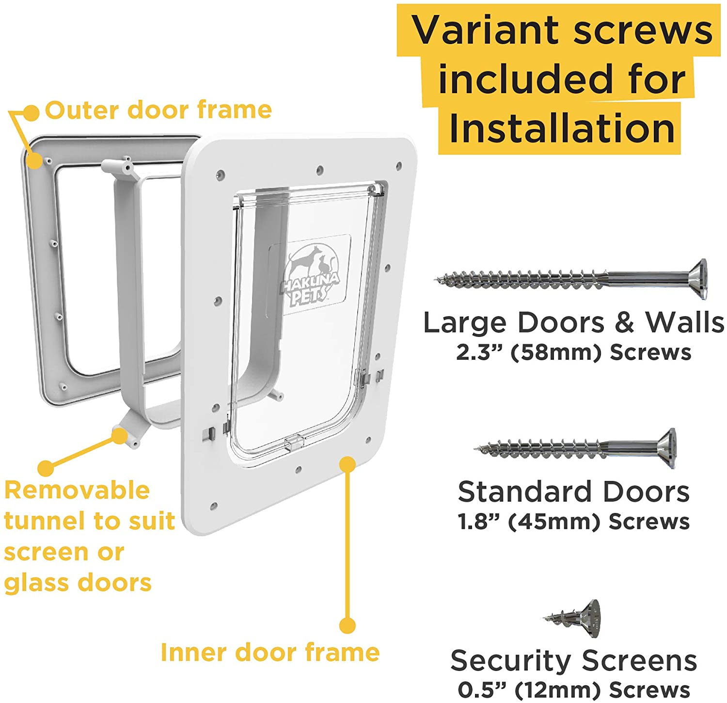 Stop feeling guilty about leaving your pet at home and give them the freedom to come and go as they please. The medium Super Tough Pet Door with tunnel can be used for most cat breeds and dogs up to 42 pounds. The outer frame measures 15.28" x 12.4". The clear plastic door measures 11.42" x 8.66", with a virtually unbreakable polycarbonate flap suitable for even the most energetic dogs. This pet door is uniquely designed for doors, screens, and walls up to 2.17 inches thick to allow your four-legged friend the freedom he or she needs for happiness and health. The two way controlled access allows your pet open access with magnetic centering flap to ensure the door shuts after each use, keeping out drafts and weather. You can also change the access to locked, keeping your pet inside or out. Have complete peace of mind knowing that the Super Tough Pet Door is designed to last and includes an industry leading 3 year limited warranty. Hakuna Pets is a dedicated pet care company, specializing in independence and safety technology to improve the lives of pets and their people. To create better lives, it is our mission to make the best in pet care available and affordable to homes and families around the world with a range of door types and sizes to suit all breeds and needs.