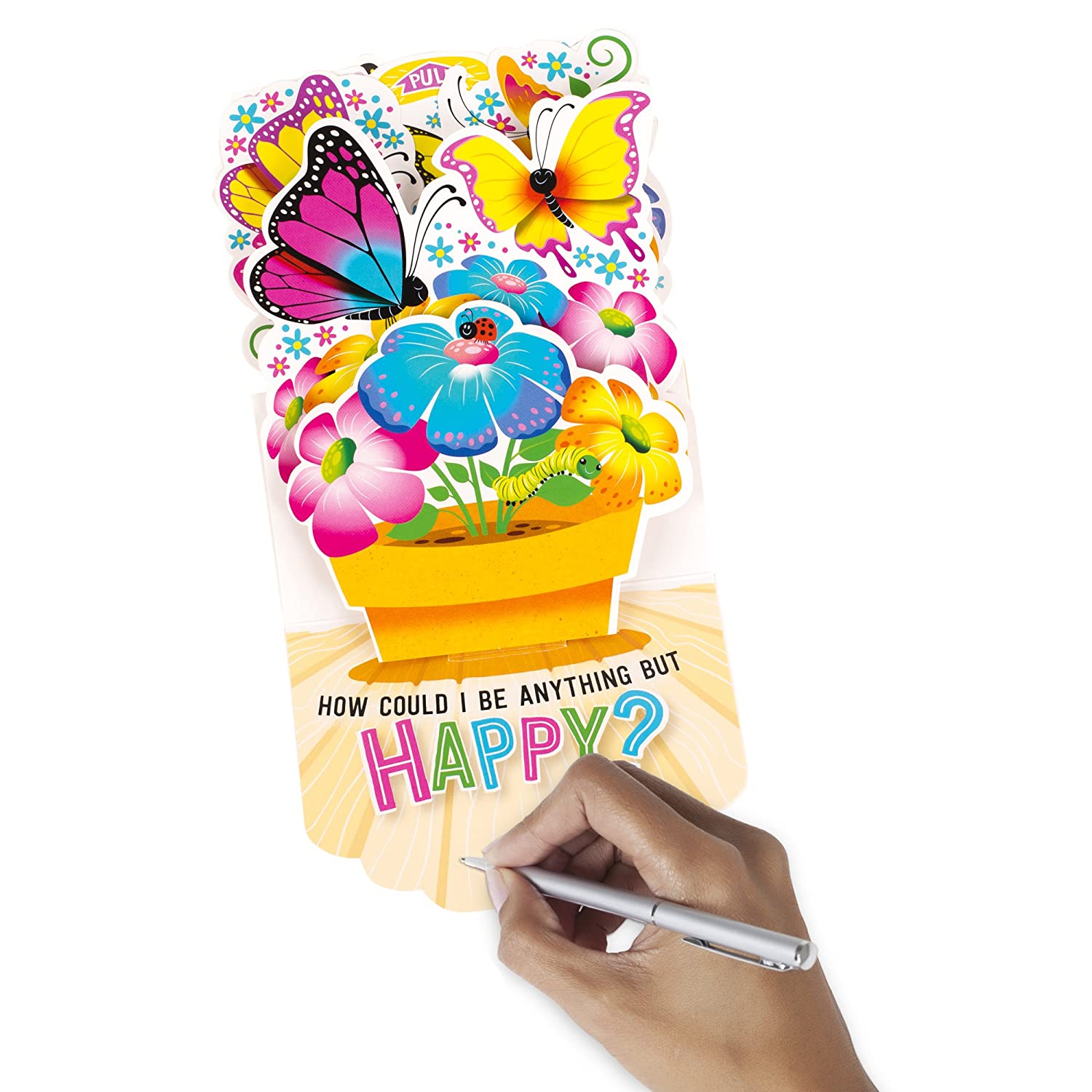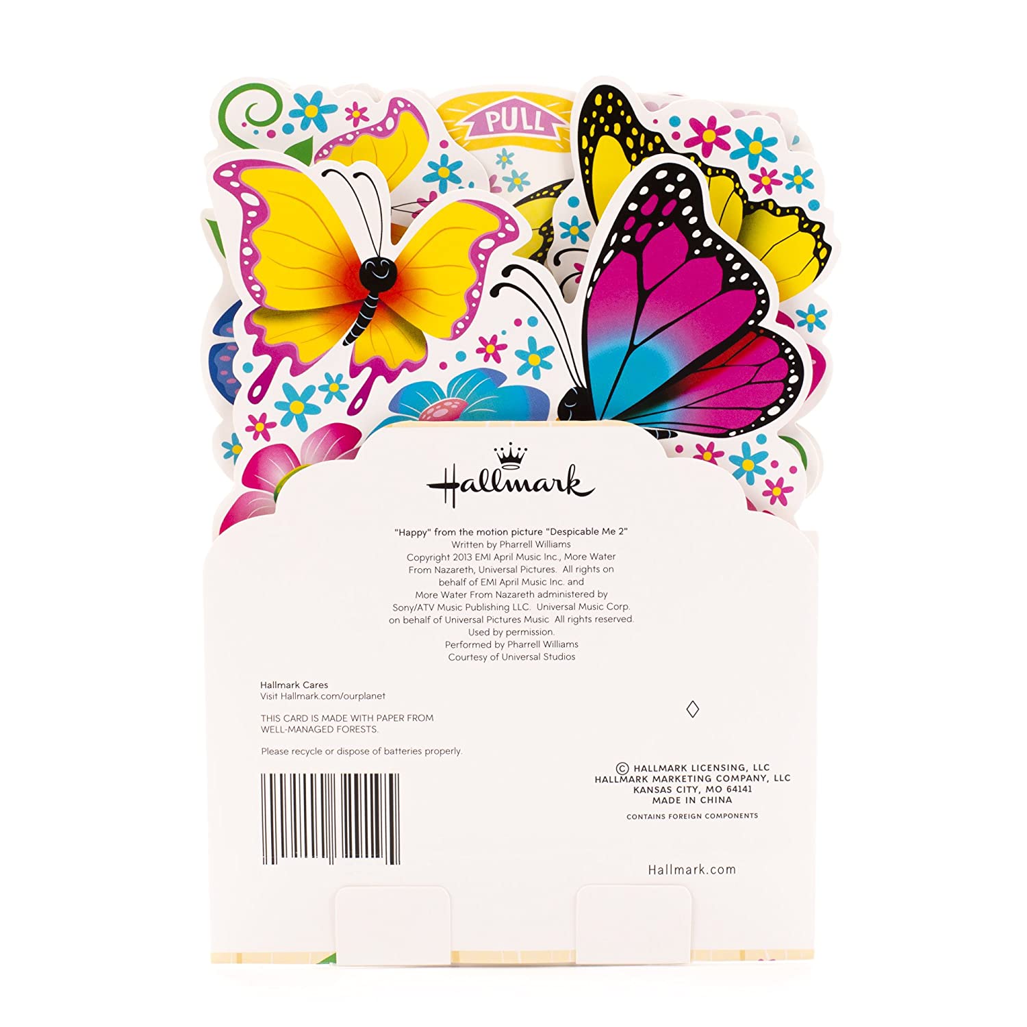 - Cover features a cheerful springtime design of die-cut flowers and butterflies peeking over the top of a garden fence. When mom pulls the tab at the top, the card unfolds into a beautiful bouquet of butterflies and blossoms sprouting from a terra cotta pot. Press the button on this musical card to hear "Happy" by Pharrell Williams and the message: "How could I be anything but happy? Happy Mother's Day."
