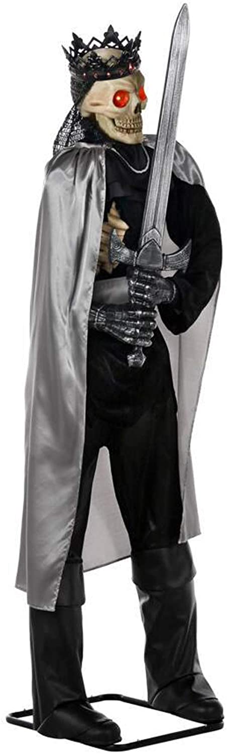 Rising up from the crypts of medieval times, this skeleton knight is ready to settle some old scores. Fully dressed in medieval knight attire, this knight comes ready to battle with his trusty sword. Complete with LED glowing eyes and moving mouth, he will leave your guests in awe with his haunting presence.