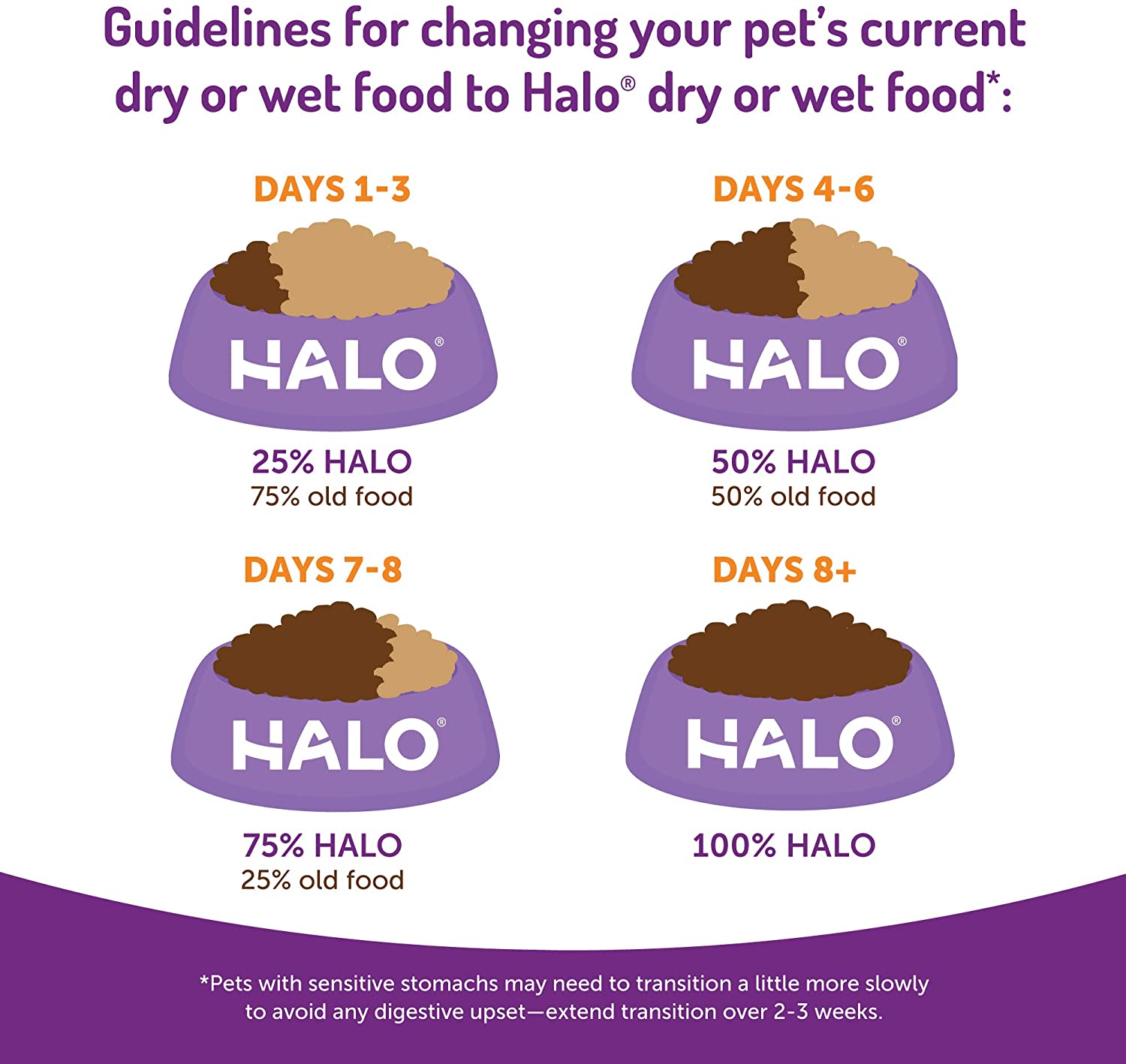 Halo uses real WHOLE meat, poultry, or fish, and NO "meat meal" of ANY kind in our natural cat food. Our healthy weight grain free indoor cat food is made with reduced calories and fat to support weight reduction and fiber to help your cat feel full. Halo cat food is now made with Dream Coat—fatty acids from non-GMO plant sources and Vitamin E—to support healthy skin and shiny coat. We also have cat food options for special diets, including kitten food, senior cat food, and sensitive stomach cat food. At Halo, WHOLE Makes a Whole Lot of Difference is the philosophy that drives our holistic approach to ingredient sourcing, recipes, nutritional value, the welfare of ALL animals, and our overall mission to change the way companion animals are fed and farm animals are raised…for the better!