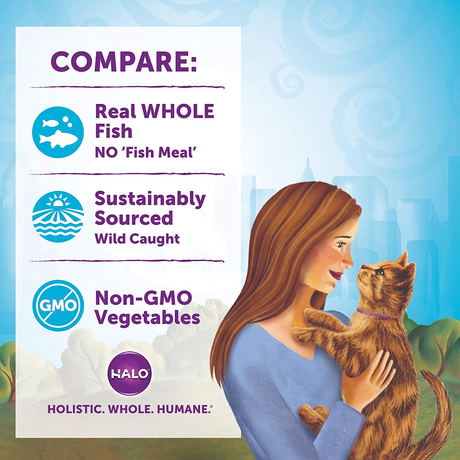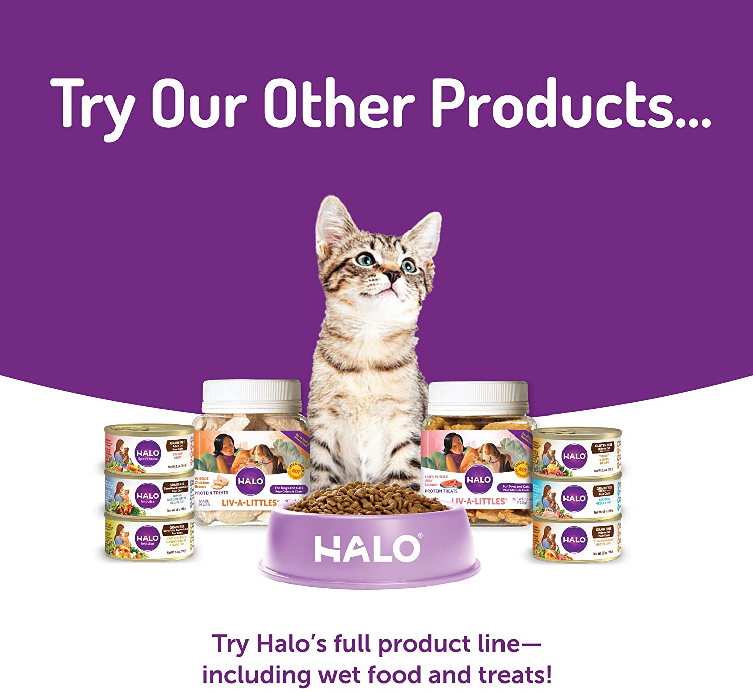 Halo uses real WHOLE meat, poultry, or fish, and NO "meat meal" of ANY kind in our natural cat food. Our sensitive stomach cat food is made with novel proteins and refined whole grains to support easy digestion. Halo cat food is now made with Dream Coat—fatty acids from non-GMO plant sources and Vitamin E—to support healthy skin and shiny coat. We also have cat food options for special diets, including kitten food, indoor cat food, senior cat food, and grain free cat food. At Halo, WHOLE Makes a Whole Lot of Difference is the philosophy that drives our holistic approach to ingredient sourcing, recipes, nutritional value, the welfare of ALL animals, and our overall mission to change the way companion animals are fed and farm animals are raised…for the better!