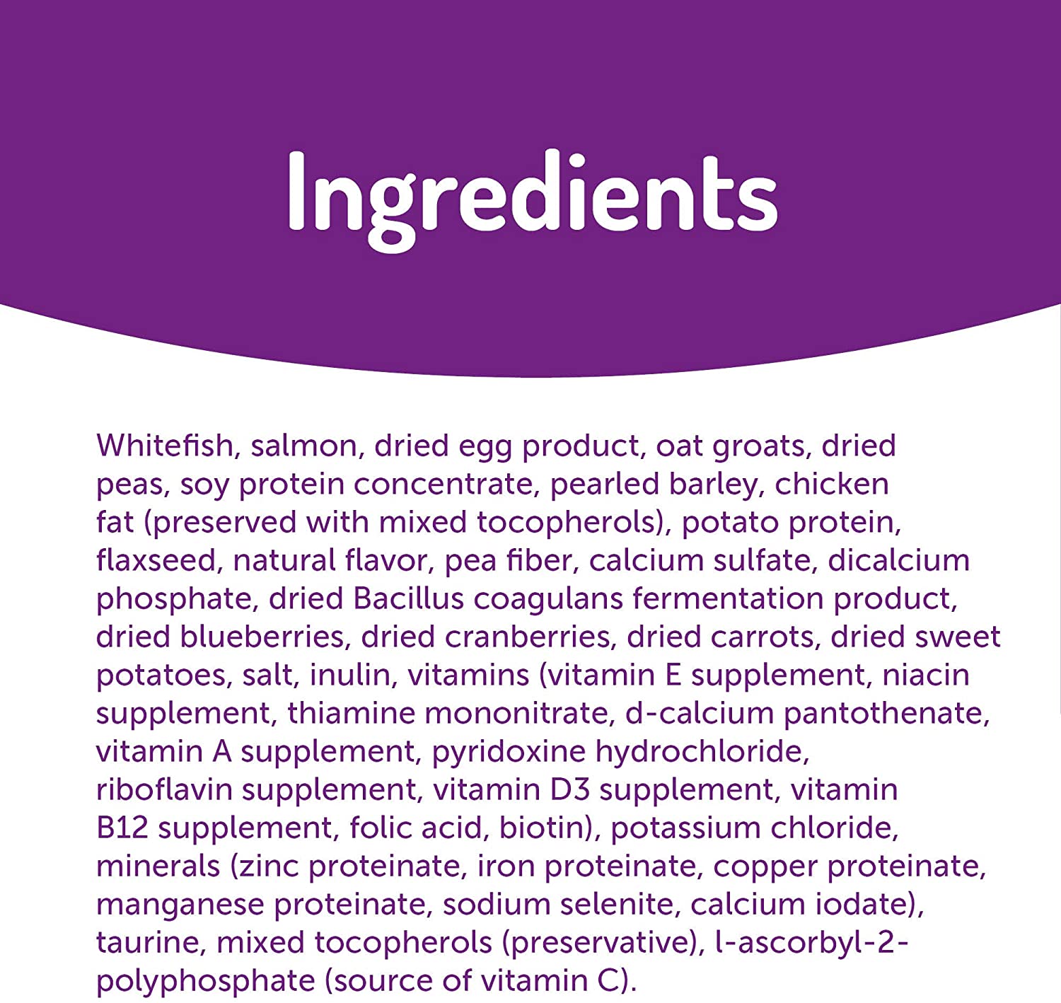- Cat food made with WHOLE whitefish, salmon, grains, and non-GMO vegetables