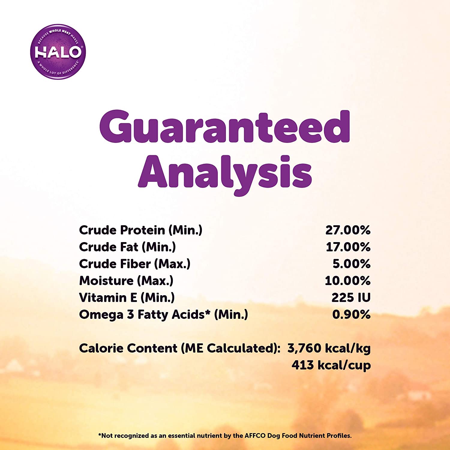 Premium ingredients and sustainable practices come together in Halo Natural Dry Dog Food. Our small breed adult dog food is a holistic blend of nutritious whole meat (that’s right, WHOLE MEAT), with non-GMO fruits and veggies plus the essential vitamins and minerals that your dog needs to look and feel their best. Free from artificial colors, flavors, and preservatives, our dog food is also highly digestible - letting your furry friend retain and use more of their food’s nutrients. These premium ingredients not only help with sensitive stomachs, but are designed especially for the needs of small breed dogs. Our aim isn’t just healthy dog food but also humane practices. You can be confident every time you buy Halo dog food, as we steer clear of factory farms, utilize non-GMO fruits and vegetables, and support sustainability through responsible ingredient sourcing. Please refer to the feeding recommendations listed in the product details section of this page or on the packaging.