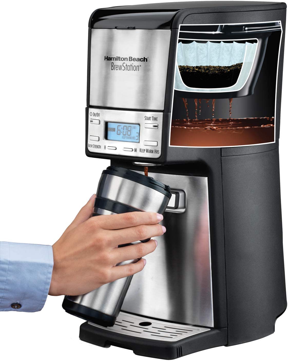 No matter how much you try, it’s impossible to get freshly brewed flavor from coffee that’s been sitting on a hot plate too long. That’s why we created the Hamilton Beach BrewStation, the only coffeemaker that keeps coffee tasting fresh for up to four hours. This best-selling coffee maker works just like a traditional, automatic drip brewer, but with a notable difference: it brews into an internal tank instead of a carafe. This innovation in brewing technology is what will make your last cup taste just as fresh as the first. An internal heater keeps coffee at the perfect temperature for up to four hours, so you can refuel with a fresh, hot cup throughout your morning. And with no glass carafe, you have nothing fragile to break and replace. Instead, you can easily pour a cup with the one-handed simplicity of a dispensing bar. The BrewStation lets you customize your cup with brewing options like bold, regular, small batches and even iced coffee. The internal tank and brew basket both remove for easy fill-up and cleaning.