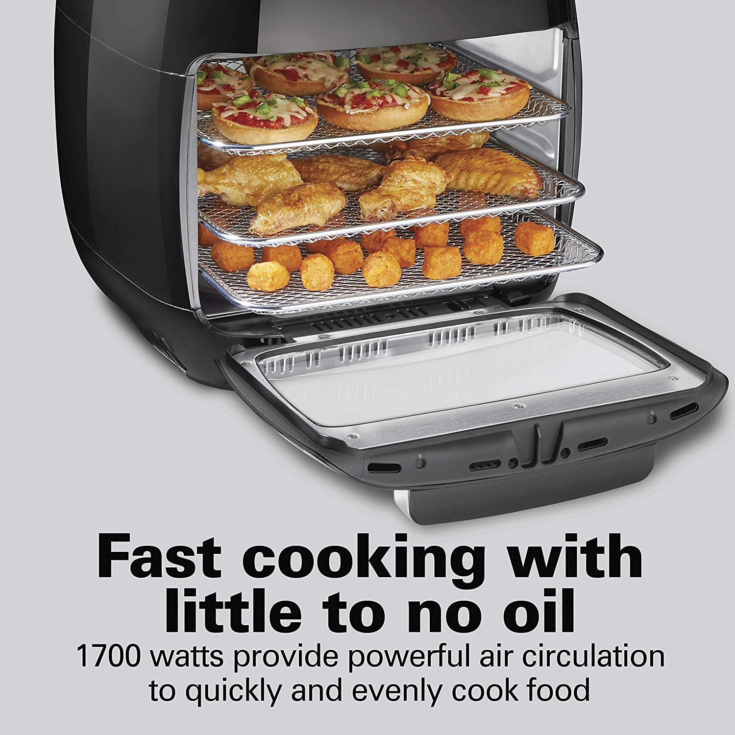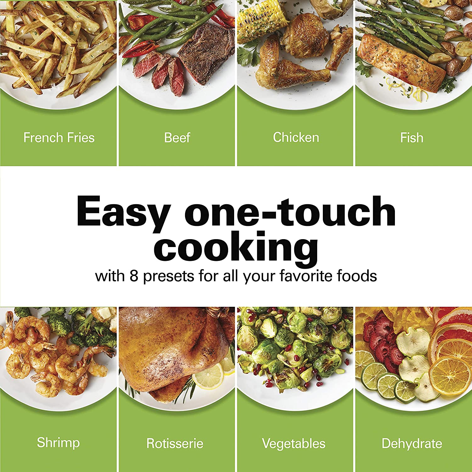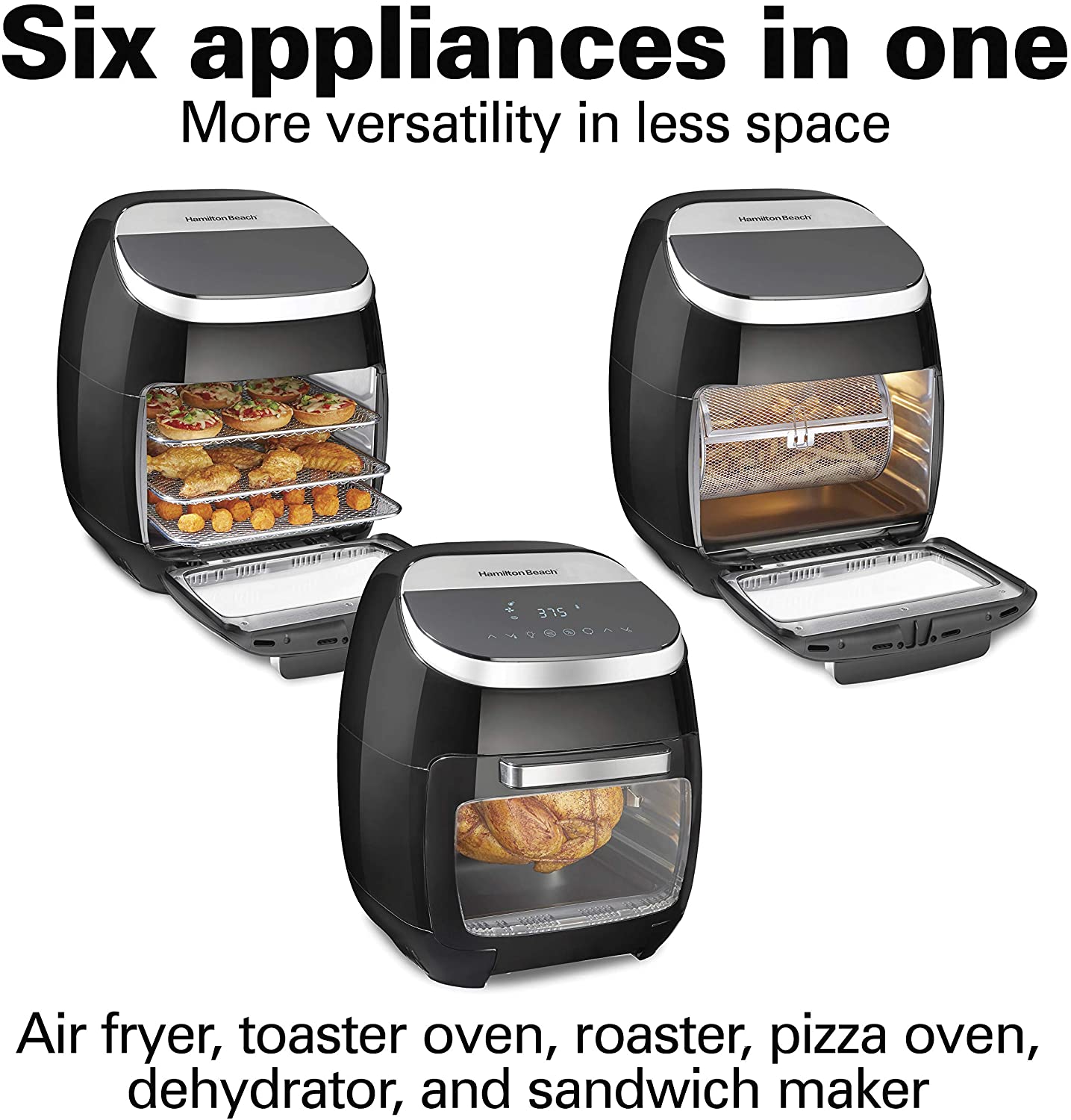 With the Hamilton Beach 11 6 Quarts digital air fryer oven with Rotisserie and rotating basket you can feed a large family and air fry to perfection With 8 one-touch preset functions you'll use it for everything from air frying and baking to roasting Rotisserie and dehydrating You'll find that Hamilton Beach air fryer ovens are the only cooking appliance you'll ever need on your countertop — with 1700 watts it's a powerful air fryer toaster oven roaster pizza oven food Dehydrator and sandwich maker all in one.