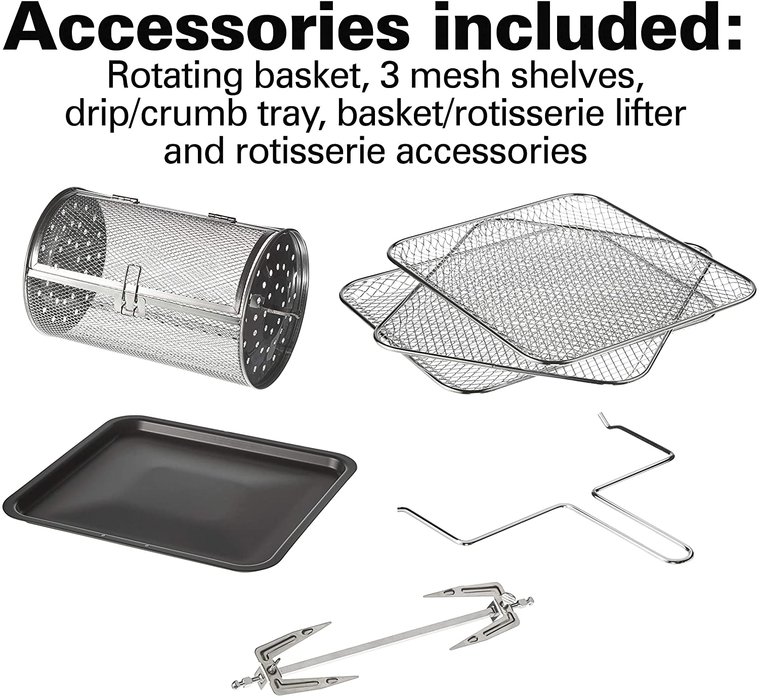 - Includes 3 metal mesh shelves rotating basket drip/crumb tray basket/Rotisserie lifter and rotisserie accessories mesh shelves let air circulate around food for expert air frying and dehydrating Rotating basket tumbles food for crispy even results