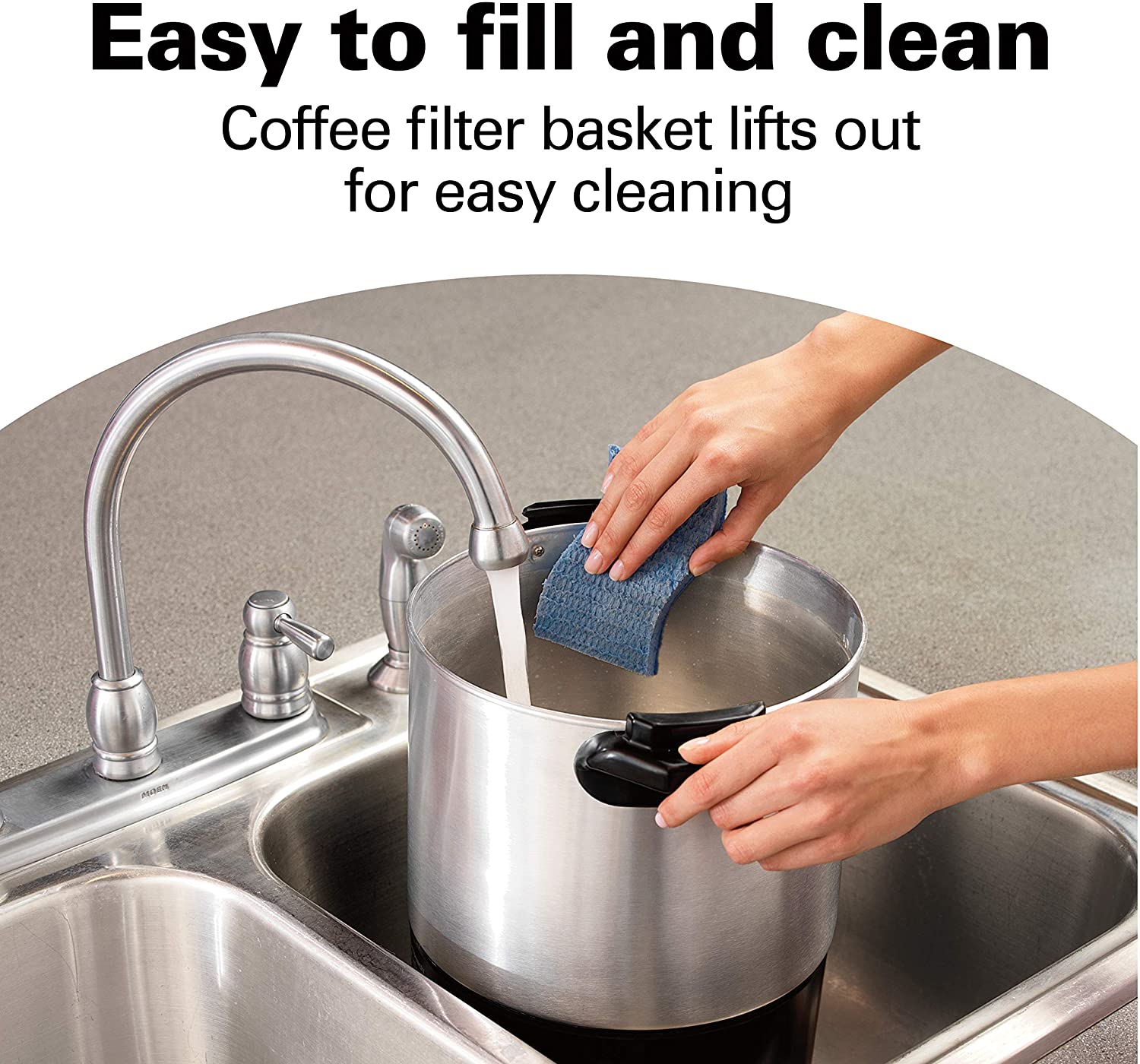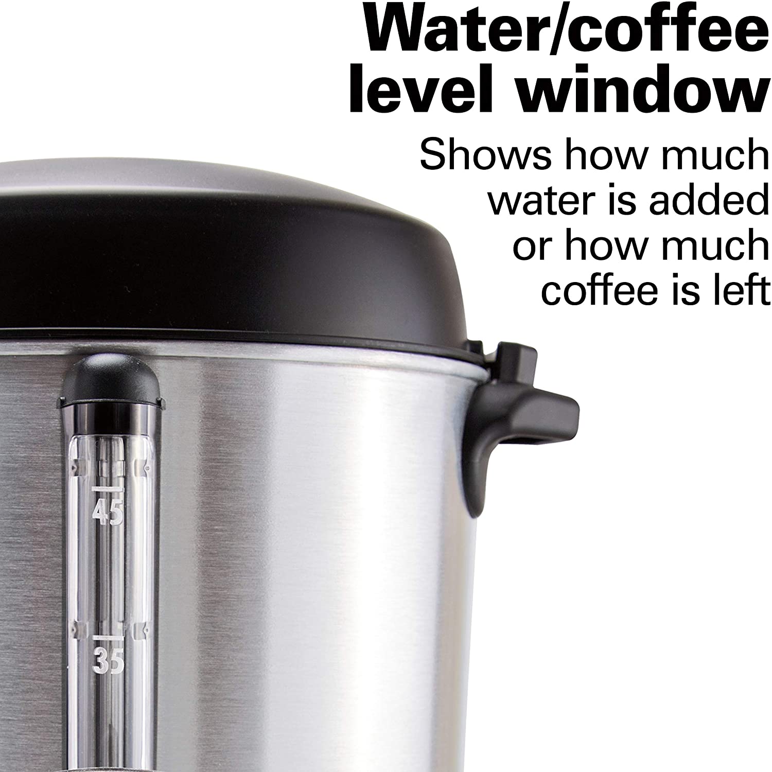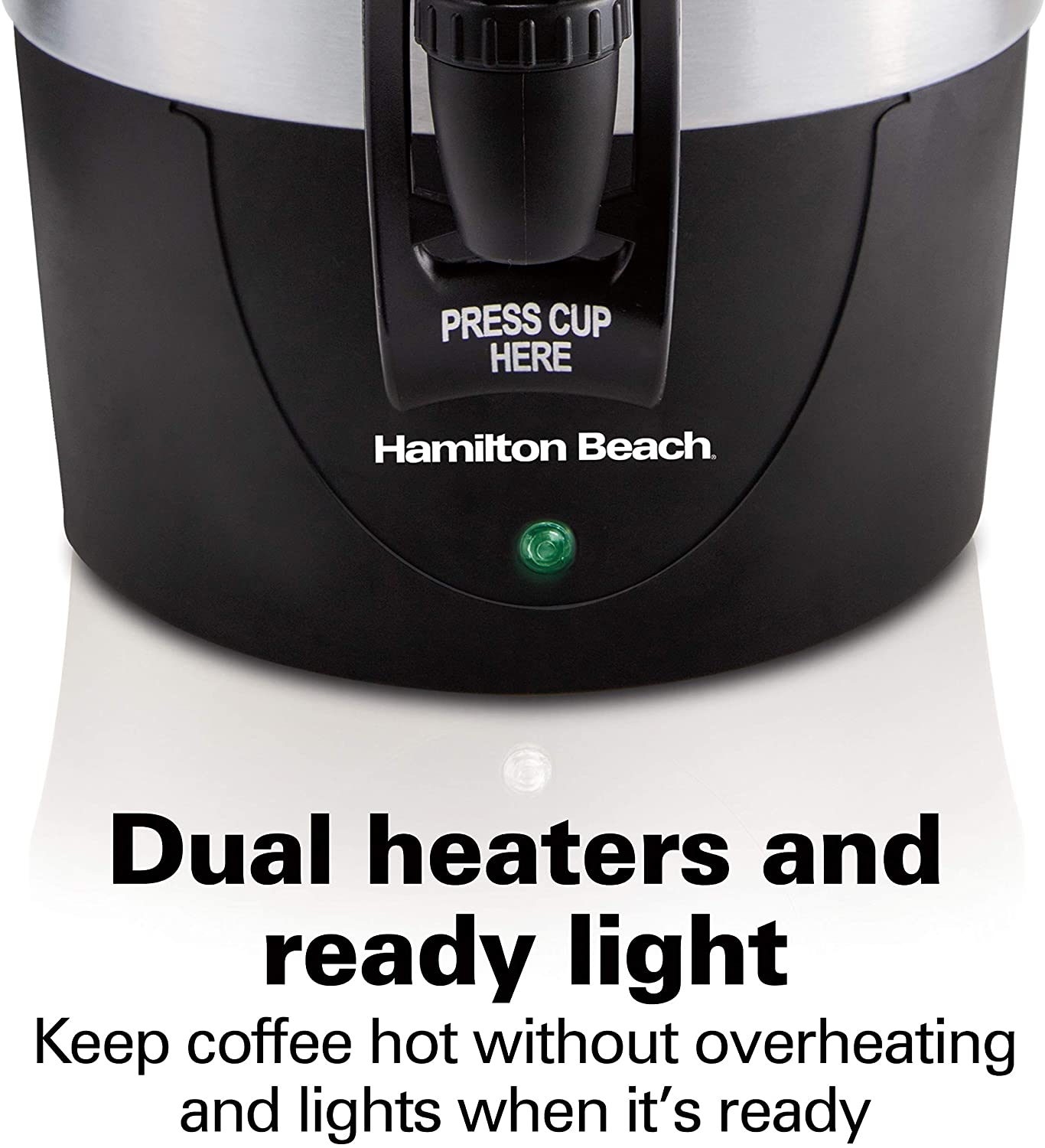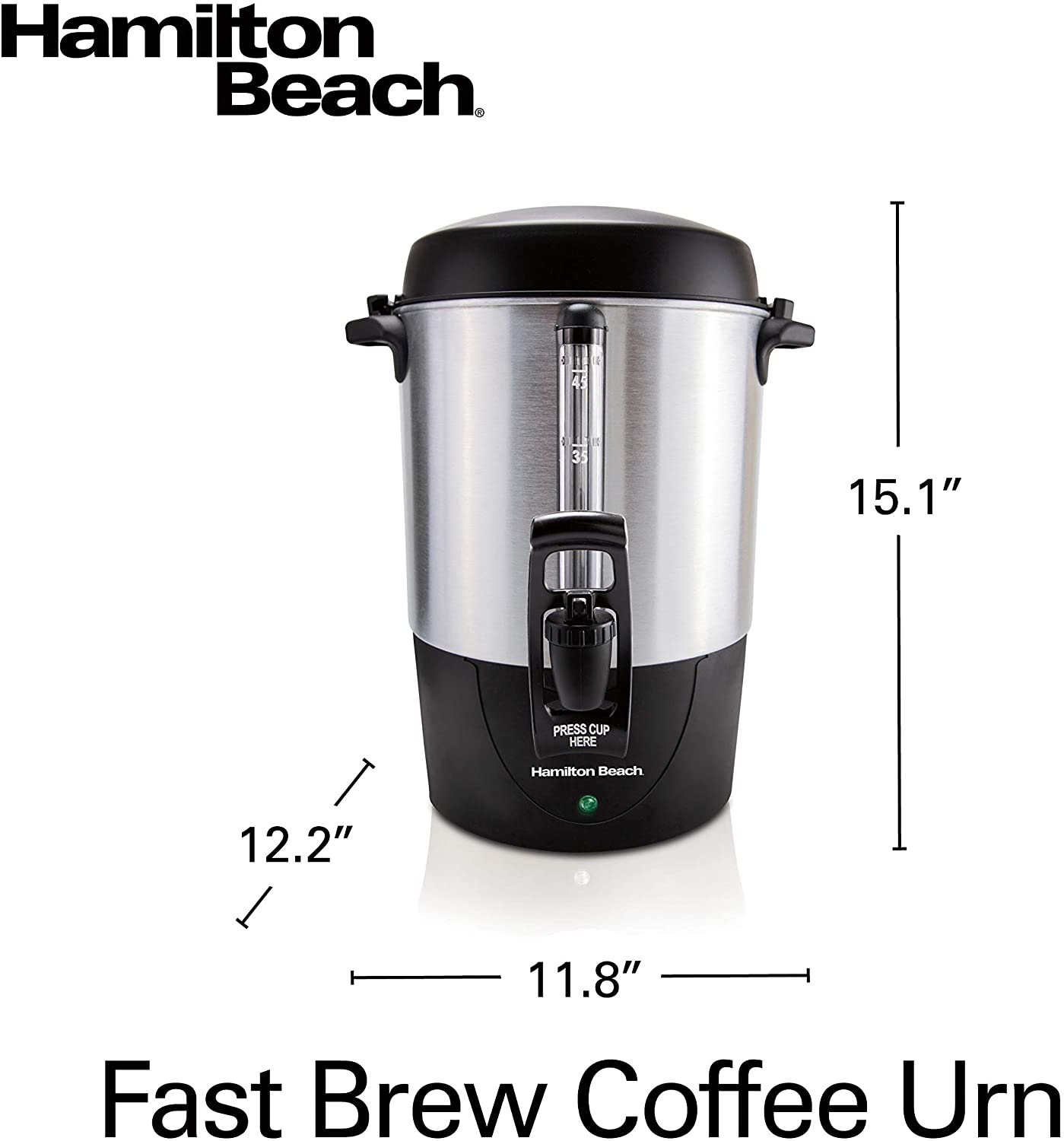 The Hamilton Beach fast brew Coffee Urn brews coffee 30% faster*, reducing wait-time for your guests. The urn makes 15-45 Cups of Coffee, and brews 45 cups in just 28 minutes. The urn features dual heaters to keep Coffee hot without overheating. The ready light illuminates to let you know when the coffee's ready to serve. The urn is also great to use for hot tea and other drinks. Coffee is easy to pour from the urn using the easy-press lever, which is activated at the push of a cup making it easy to pour Coffee using just one hand. The urn easily dispenses Coffee into any kind of cup, even disposable cups. Clear water level markings in the urn's water/coffee level window make it easy to see how much water you're adding or how much coffee is left in the urn. The removable Coffee filter basket lifts from the urn and is easy to clean in the dishwasher. No paper filters are needed. The brushed finish looks great with every decor and resists fingerprints. The handles stay cool to the touch for comfort, and the lid on the large coffee maker locks in place to eliminate spills. *At full capacity, compared to the best selling Coffee Urn in the U. S. And Mexico (source: npd Group, 12 months ending December 2018)