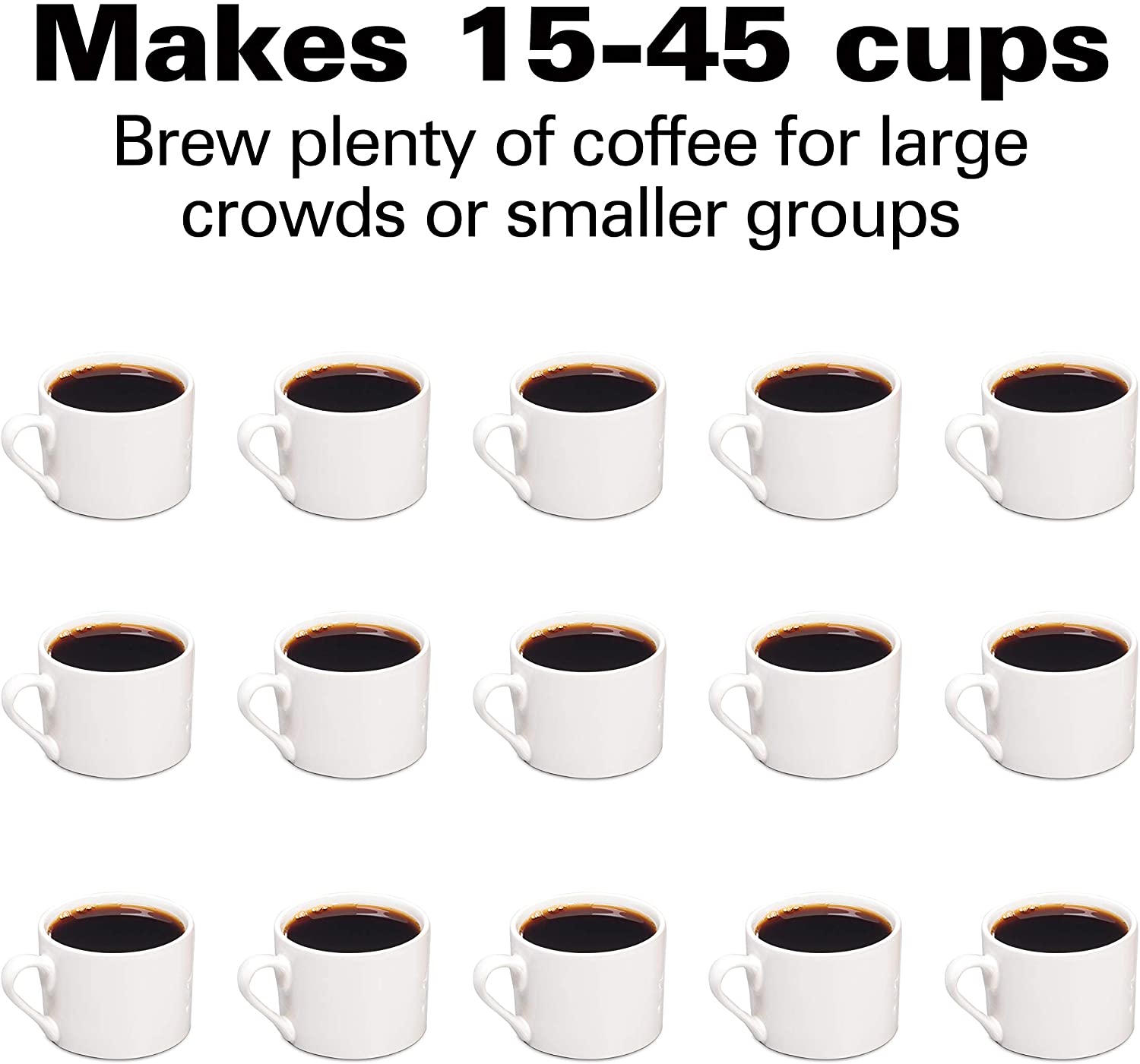 • Makes 15-45 cups — brew plenty of Coffee for large crowds when you need it, or brew less for smaller groups. Either way, this urn keeps Coffee hot and ready to pour after it's finished brewing.