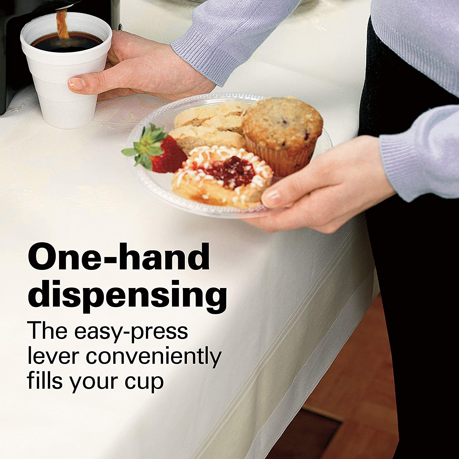 • One-hand dispensing — push the easy-press lever with your Coffee cup to conveniently pour Coffee using just one hand. The Coffee Urn easily dispenses Coffee into any kind of cup, including disposable cups.