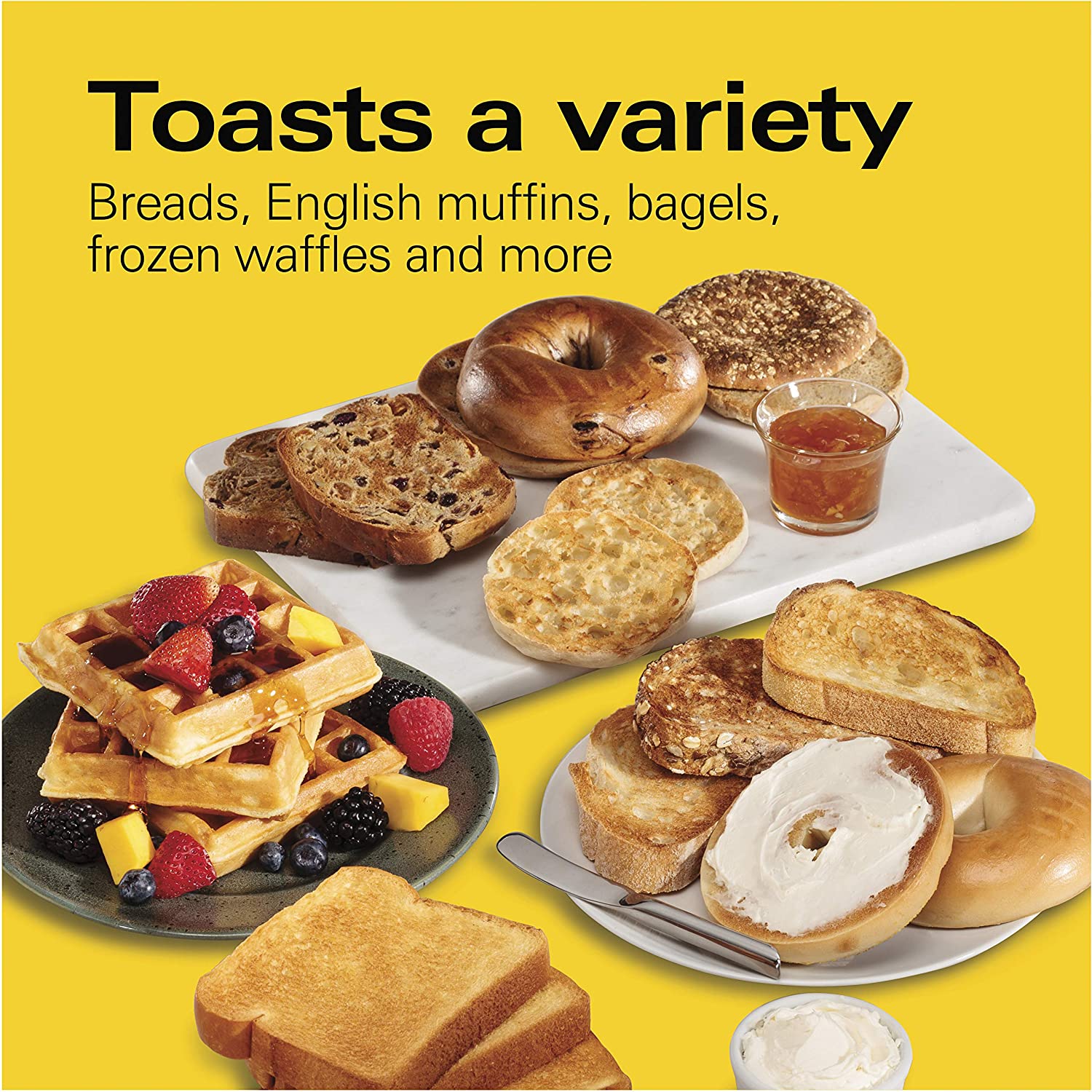 - 4 slice toaster has large slots to easily fit bagels and Thick slices of artisanal, in addition to smaller favorites like English muffins and frozen waffles.