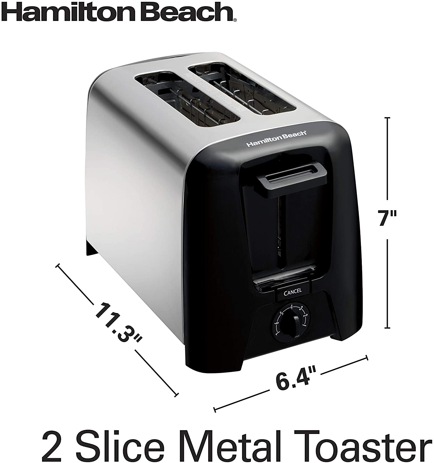 The Hamilton Beach Cool Wall 2-Slice Toaster has the style and functionality that you will love to add to your kitchen counter. It has extra-wide slots that fit thick slices of bread or bagels. The toaster comes with a cool chrome exterior that will not burn your hands if the sides are accidentally touched. The chrome Hamilton Beach toaster also has many features that make it an ideal choice for your home. It has a toast shade selector, cancel button, automatic shut-off and handy cord storage so that the electric cord can stay up and out of the way when the device is not in use. The Hamilton Beach 2-Slice toaster lets you quickly prepare meals or enjoy toasted snacks any time of day, while also providing you with peace of mind. It is a smart choice for any kitchen, especially those with small children around. The Hamilton Beach Cool Wall 2-Slice Toaster includes a crumb tray and toast boost for even more convenience.