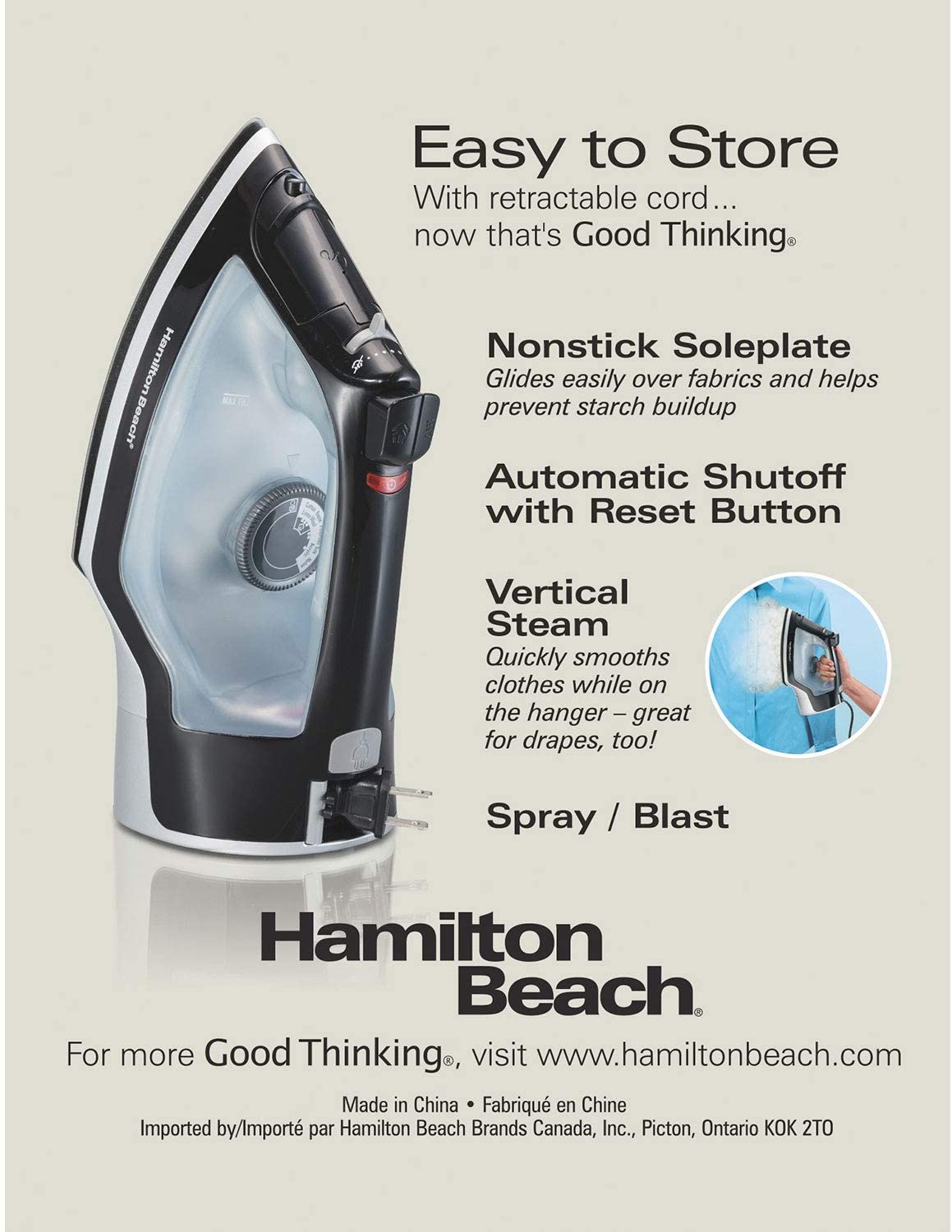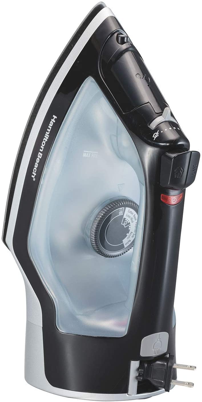 Hamilton Beach Full-Size Iron 14289 Remove wrinkles fast with the coverage only a full-size iron can give. Easily take creases out of stubborn materials; get shirts impeccably crisp and tablecloths pressed to perfection. The nonstick soleplate protects fabrics and prevents unwanted starch build-up. And adjustable steam options allow you to choose the right amount for each garment. The powerful blast is a must for natural fabrics such as cotton or linen, and the vertical steam is ideal for use on hanging clothes or drapes. Automatic shutoff gives you peace of mind. And the push-button retractable cord adds storage convenience. Quality performance and useful features make the Hamilton Beach Full-Size Iron the choice for all your home ironing needs.Features and Benefits:Easy to store with retractable cordVertical steam quickly smooths clothes while on the hanger - great for drapes tooPowerful spray & blastAdjustable steamAuto shutoff with reset buttonNonstick soleplate glides easily over fabrics and helps prevent starch buildup